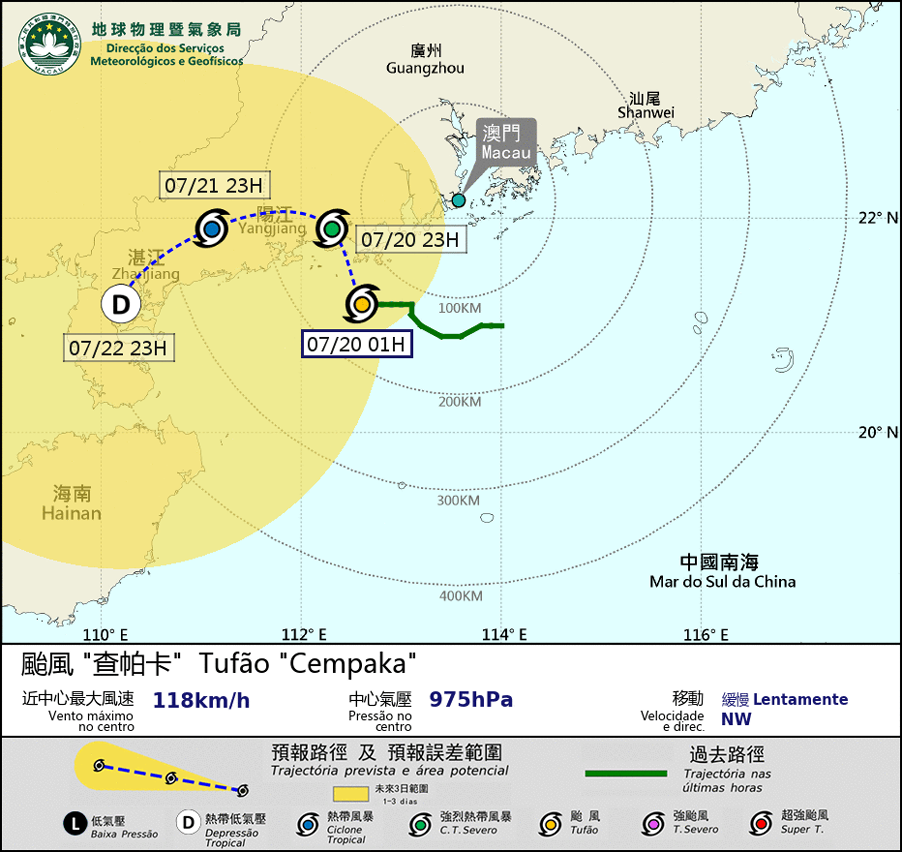 Typhoon Cempaka was intensifying and moving more westward in the past few hours. Due to its circulation is small and the movement is slow, the chance of issuing typhoon signal No. 8 before the dawn on 20th is low, unless it intensifies significantly or accelerate its approach to Macao, However, since Cempaka will intensify further and will be the closest to Macau in daytime, the chances of issuing typhoon signal No. 8 from dawn to morning remains "Medium to relatively high". Our bureau will monitor the development of Cempaka closely.