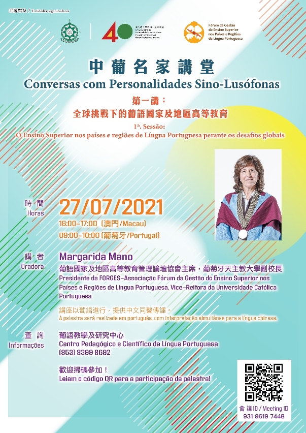 The first lecture of the "Lecture Series with Sino-Portuguese Celebrities" themed "Higher Education in Portuguese Speaking Countries and Regions Facing Global Challenges" will be held online on 27 July at 04:00 pm (Macao time)/09:00 am (Portugal time). The lecture will be conducted in Portuguese with simultaneous interpretation into Chinese and will be free of charge. Interested parties may access the QR code on the poster to attend the lecture. For further information, please contact the Center for Portuguese Studies of the Macao Polytechnic Institute on 8399 8692.