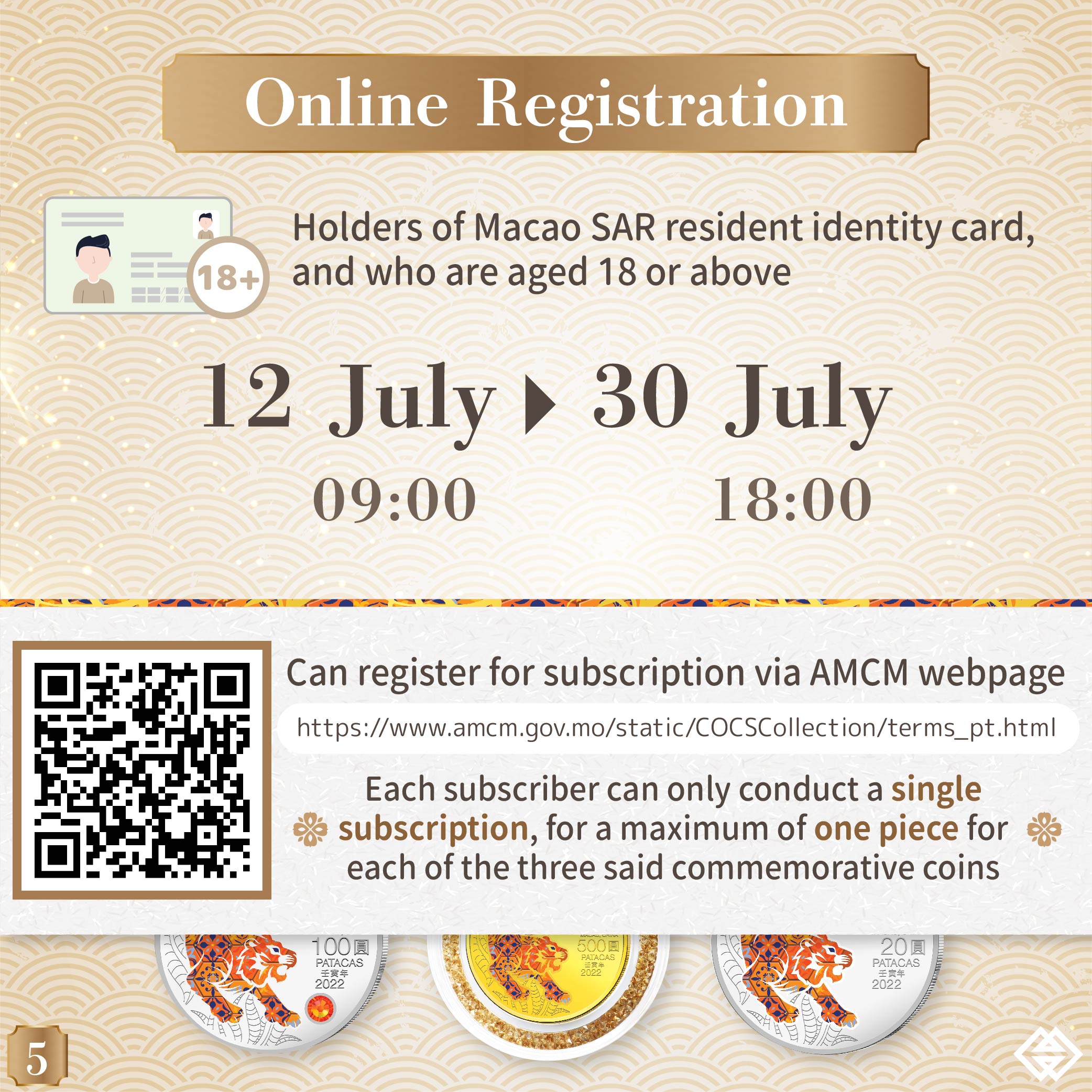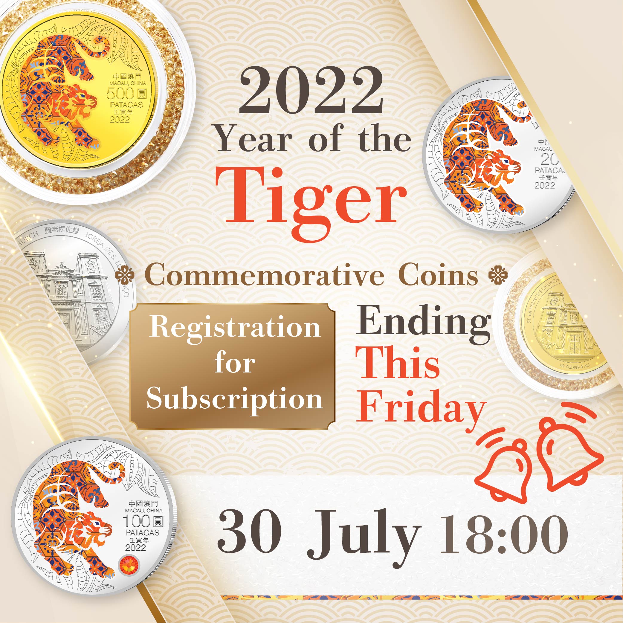 The online subscription period for the 2022 Year of the Tiger commemorative coins will end on 30 July 2021 (Friday) at 6:00pm. AMCM would like to remind Macao residents who are interested in subscribing for the said coins to complete the online subscription process before the mentioned deadline.