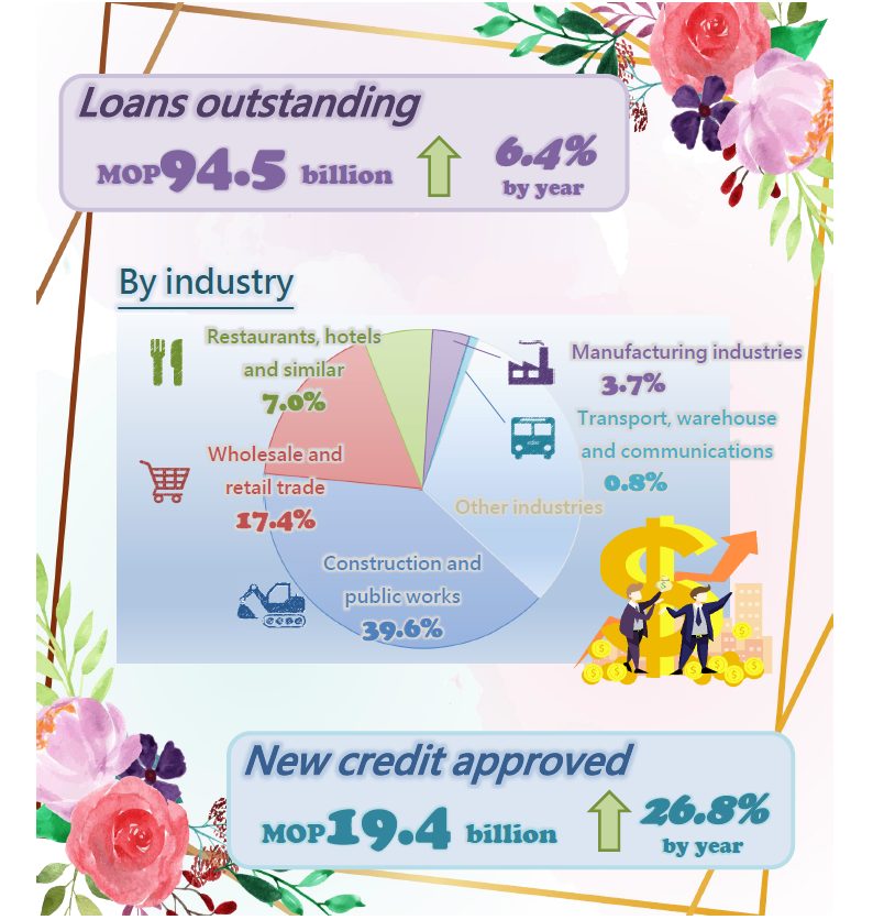 As at end-June 2021, the outstanding balance of SME loans increased 8.3% from end-2020 or 6.4% from a year earlier to MOP94.5 billion. Compared to the last survey period, outstanding SME loans to “manufacturing industries” and “wholesale and retail trade” increased at respective rates of 49.2% and 13.9% whereas those to “restaurants, hotels and similar” dropped 8.7%.