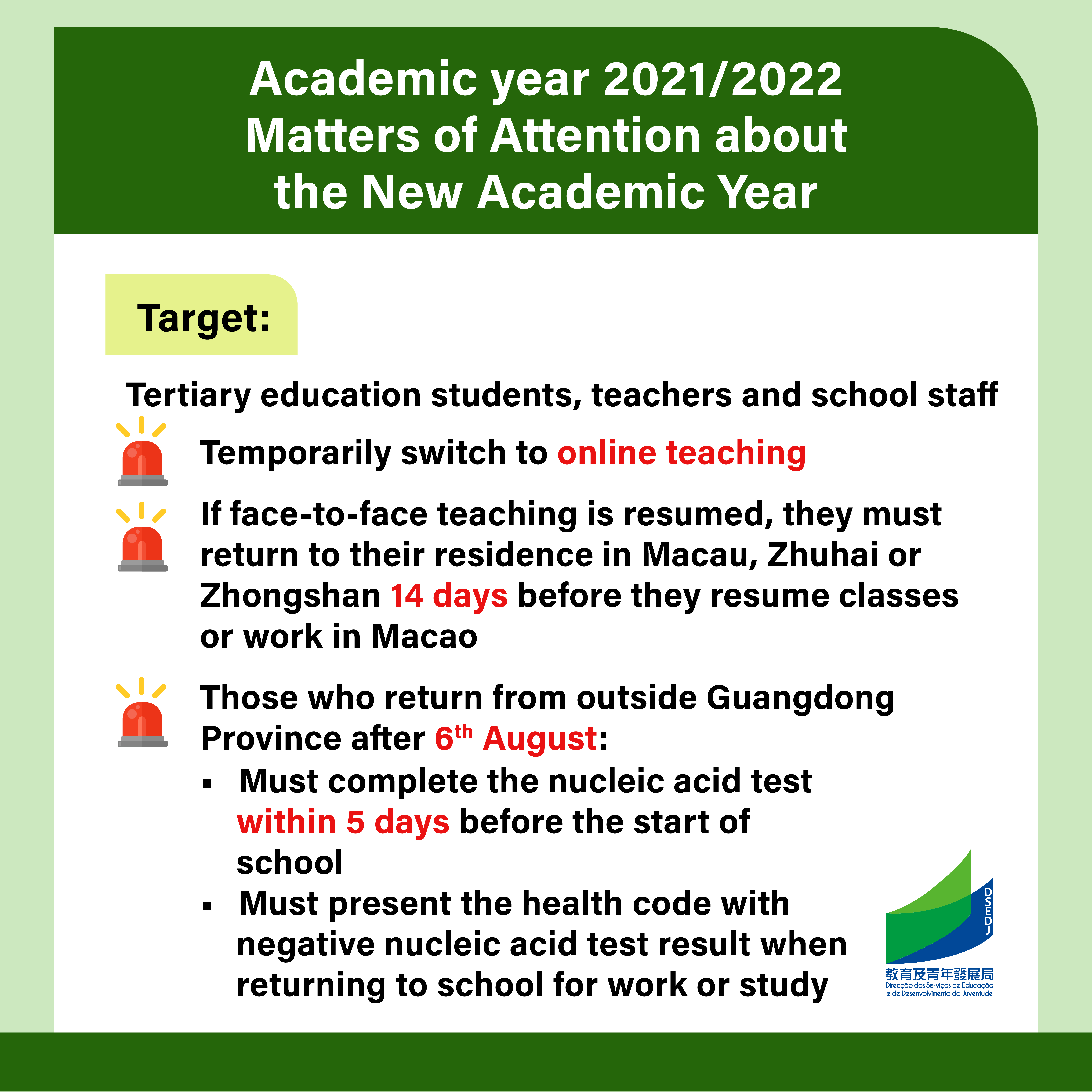 • Matters of Attention about the New Academic Year - Tertiary education students, teachers and school staff