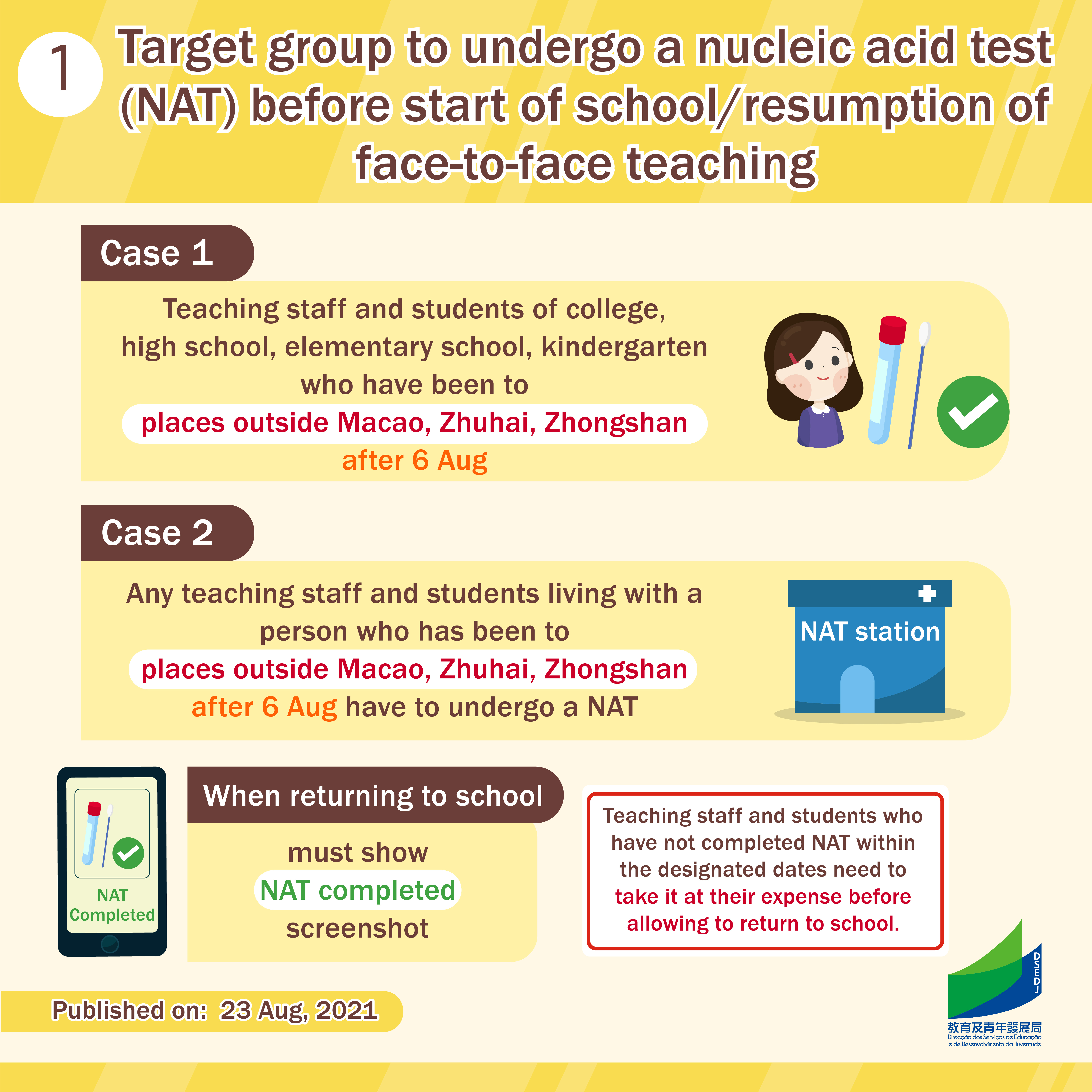 To ensure that the new school year can start safely as scheduled, safeguard students’ health, the DSEDJ and health departments will adopt the epidemic prevention measures for the start of school with higher standards and make adjustments to the preliminary plan. Some students and teaching staff will be requested to undergo a nucleic acid test 5 days before school opening or resumption of face-to-face teaching. The target groups are students and teaching staff who personally, or whose housemates, have been to places outside Macao, Zhuhai, Zhongshan after 6 Aug. Such students and teaching staff must show a screenshot indicating that the nucleic acid test is completed when returning to school.