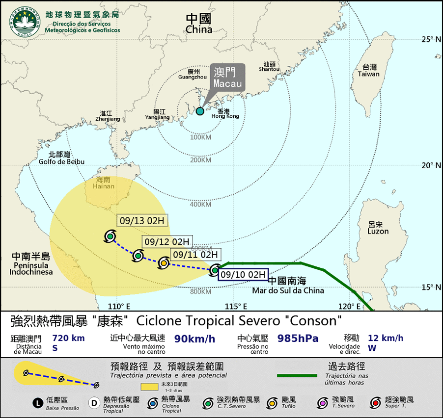 Severe Tropical Storm Conson is forecasted to move westwards across the South China Sea. It will move towards the vicinity areas of Hainan island. Since Conson will keep a distance of 600 km away from Macao, the possibility of issuing higher tropical cyclone signals is relatively low unless it moves towards a more northern track than expected or intensifies rapidly. Besides, Super Typhoon Chanthu over the northwest Pacific will move in the general direction of Taiwan. Since it is not in the high phase of the astronomical tide in the next few days and the tropical cyclones keep a distance from Macao, it is unlikely to have storm surge flooding.