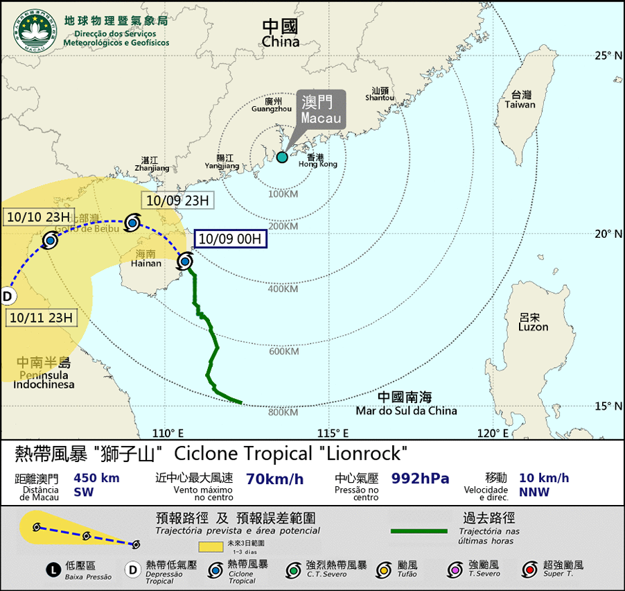 Tropical storm “Lionrock” has a broad circulation, moving at a distance of about 500 km southwest of Macao this morning, and made the landfall over Hainan Island at 23 o’clock on the 8th. Under the combined influence of “Lionrock” and the northeast monsoon, the weather in Macao will remain unstable today and tomorrow.