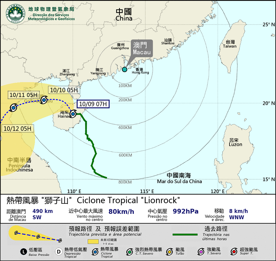 The signal No.8SE is still in effect. At 8 a.m., tropical storm "Lionrock" is located about 490 kilometers southwest of Macao, approaching the Gulf of Beibu. As the path of "Lionrock" is further north and its combined influence with the northeast monsoon is more significant than expected, winds in Macao will intensify. Gale winds will occasionally affect Macao. The maximum wind force level will be about 7 to 8, and there will be frequent heavy showers and thunderstorms.