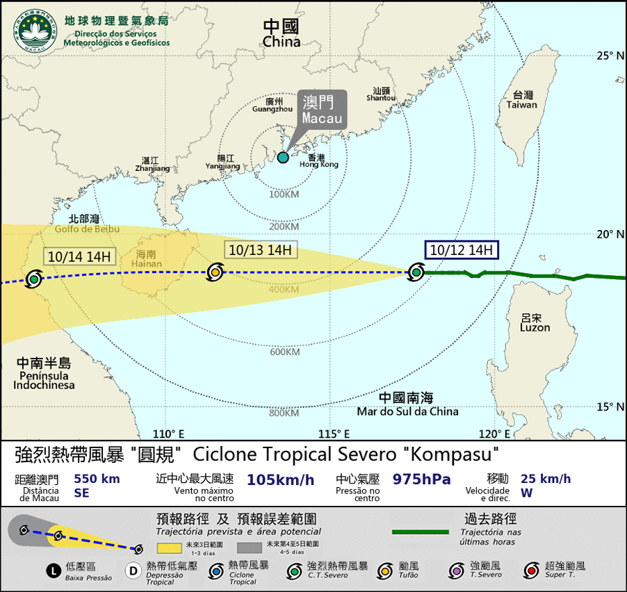Severe Tropical Storm Kompasu is intensifying gradually. It will move across the northern part of the South China Sea in these two days, and come closest to Macao between midnight and morning on the 13th, at a distance of around 400km south to Macao. It will move in the general direction to the Hainan.