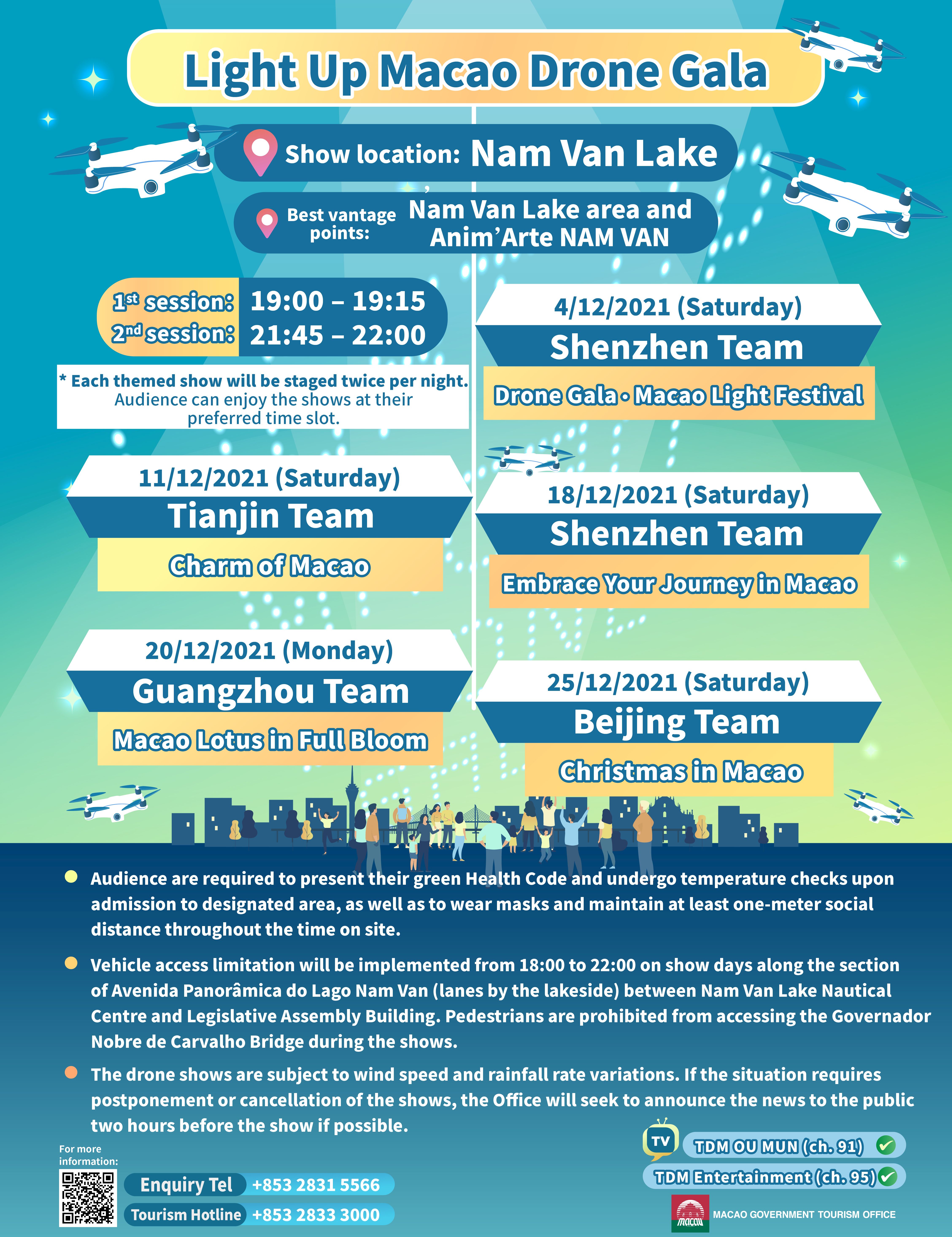 The function/performance and communication channel of drones are subject to variations in wind speed and rainfall rate. The shows can take place under suitable conditions at the wind speed of 31 – 40 km/hour or below without any rainfall. MGTO will consider the weather forecast of the Macao Meteorological and Geophysical Bureau and assess the actual situation. If the situation requires postponement or cancellation of the shows, the Office will seek to announce the news to the public two hours before the show if possible.