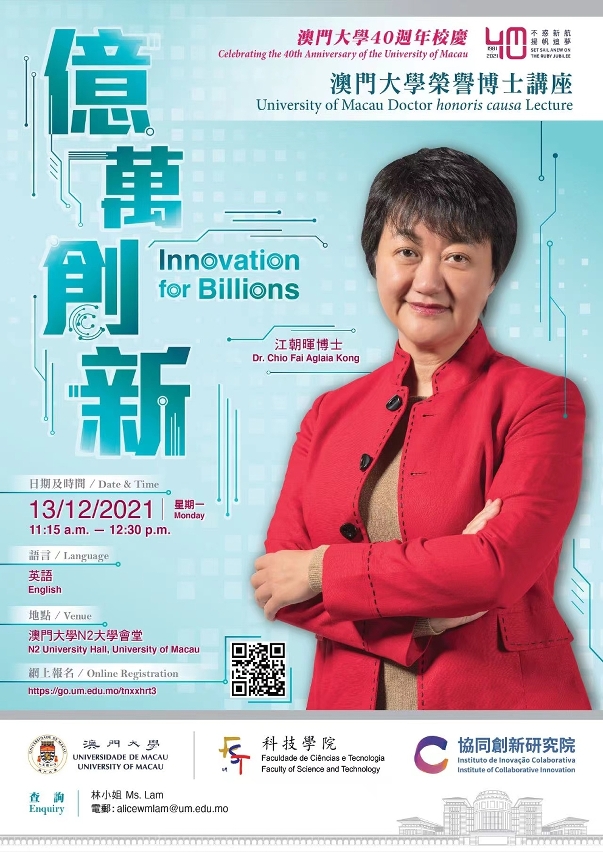 Chio Fai Aglaia Kong, an honorary degree recipient of the University of Macau (UM), on 13 December (Monday) will give a talk titled ‘Innovation for Billions’ at UM. During the talk, she will discuss how to create favourable conditions for the diversification of Macao’s industries and share her entrepreneurial experiences. All are welcome.