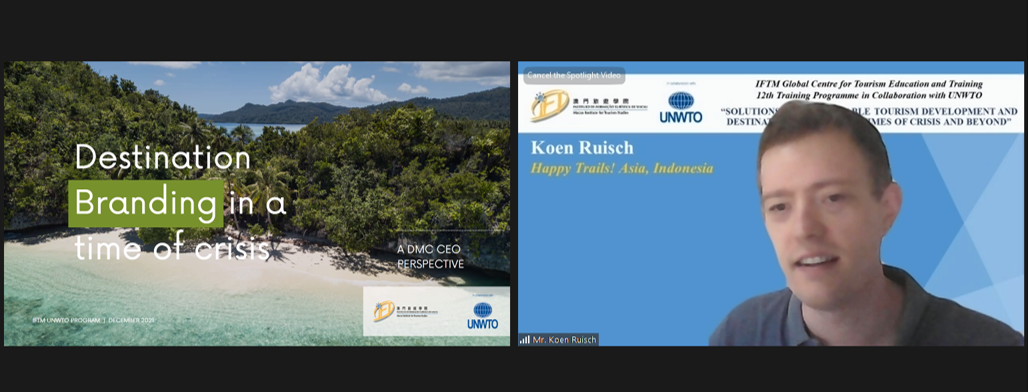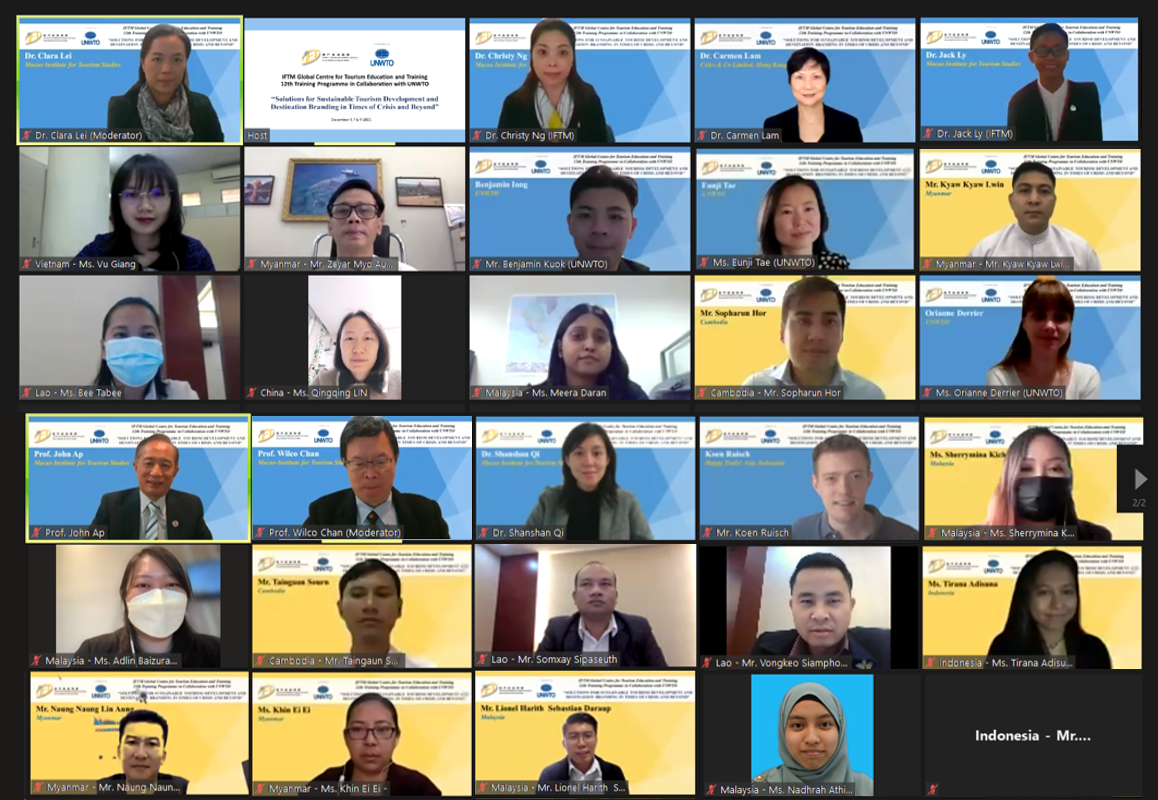 The Global Centre of Tourism Education and Training of the Macao Institute for Tourism Studies, in collaboration with United Nations World Tourism Organisation, held its second training programme this year on 6, 7 and 9 Dec 2021, which comprised three webinars based on the theme of “Solutions for Sustainable Tourism Development and Destination Branding in Times of Crisis and Beyond”. This online training programme focused on Sustainable Tourism Development, Strategic/Destination Marketing and Destination Branding.