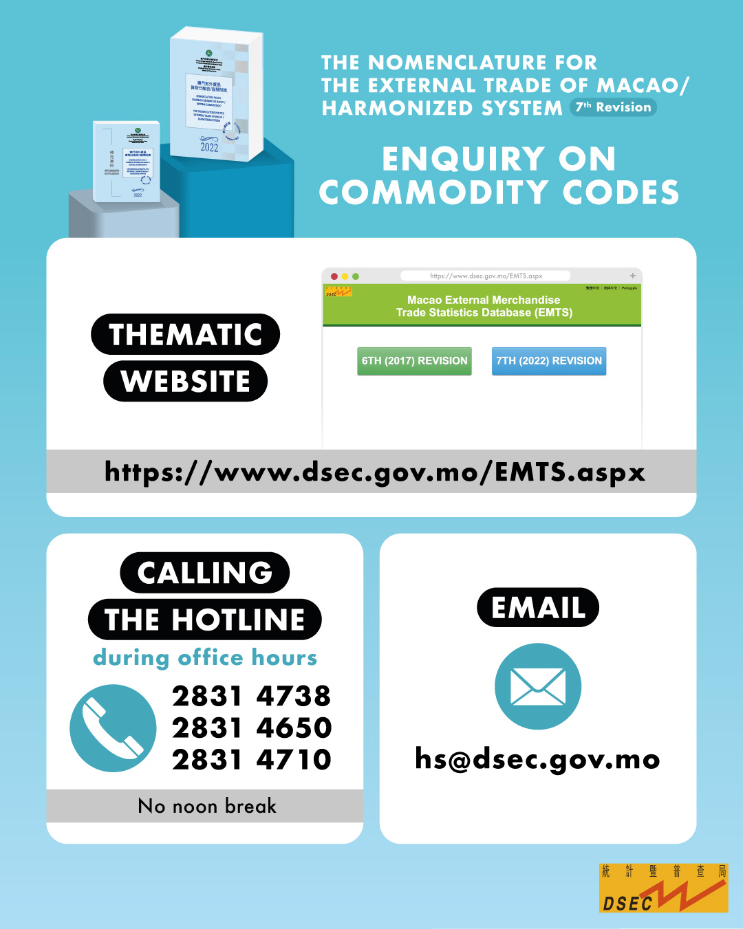 Printed copies and correlation tables of NCEM/HS Rev.7 are available free of charge to import/export practitioners and data users. To obtain a copy, please visit the Documentation and Information Centre of DSEC at Alameda Dr. Carlos d'Assumpção, No. 411-417, Dynasty Plaza, 17th floor during office hours or call the above-mentioned enquiry hotlines.