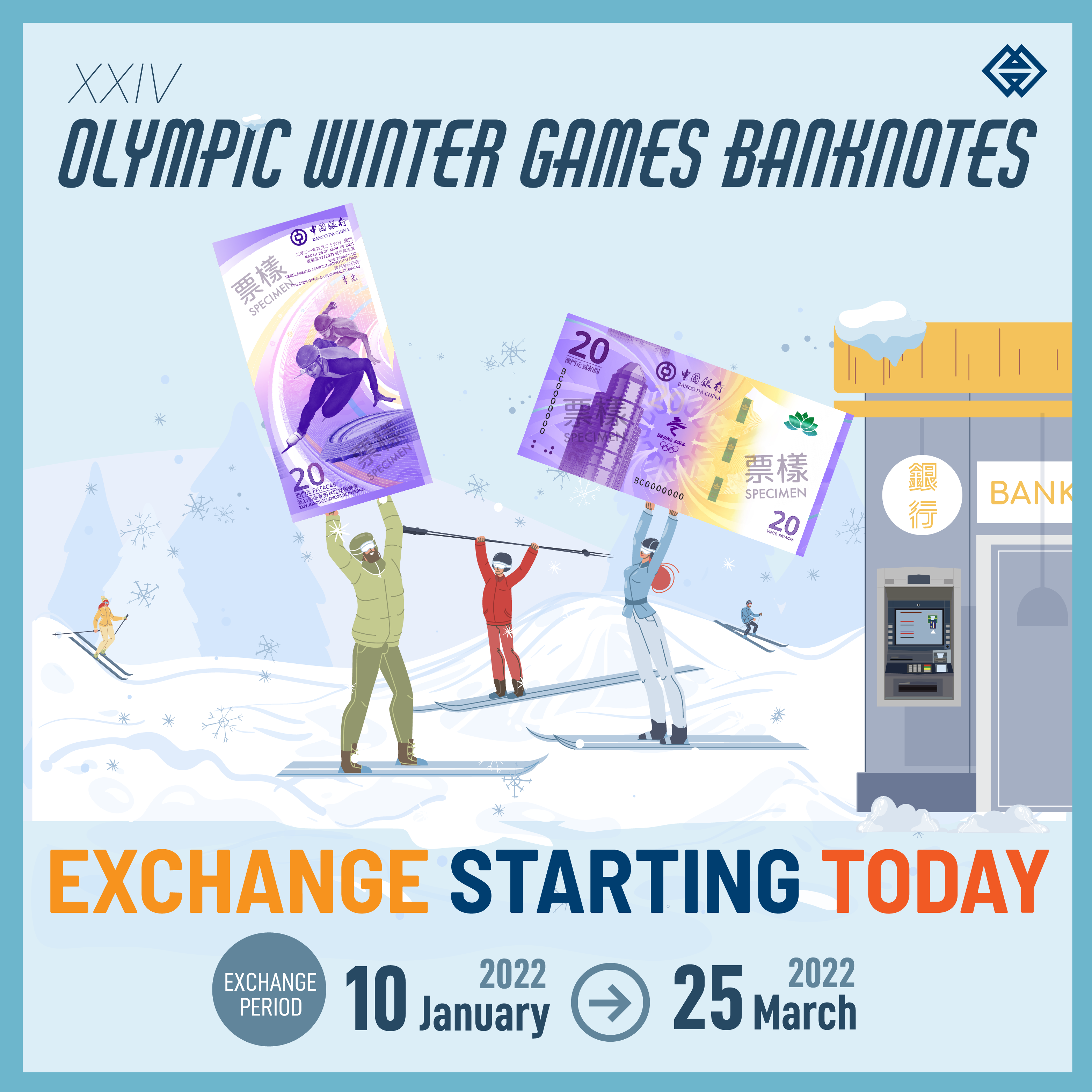 The exchange of the XXIV Olympic Winter Games banknotes starts today (10 Jan) and will end on 25 March 2022. Each registered Macao resident can bring along his/her Macao ID card to the selected bank on the selected date and exchange for 2 pieces of the XXIV Olympic Winter Games banknotes issued by the Bank of China with an amount of MOP40. Registrants may also appoint a representative to exchange such banknotes on his/her behalf, and the required authorization documents can be found at AMCM website.