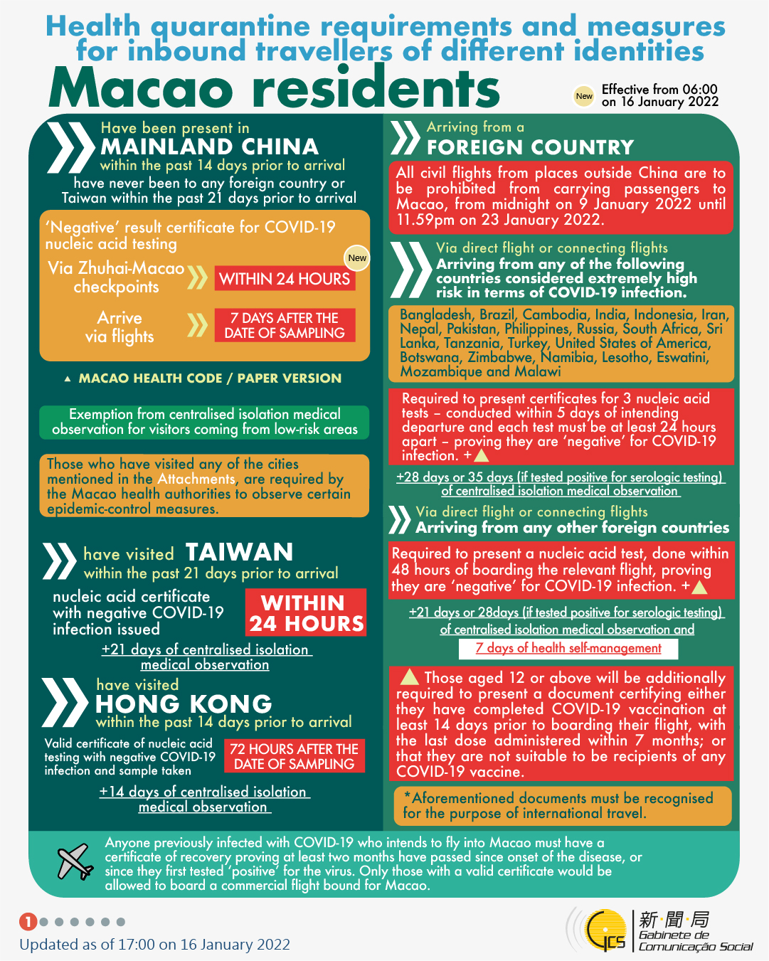 [infographic] 16 January 2022 health quarantine requirements and measures for inbound travellers of different identities.