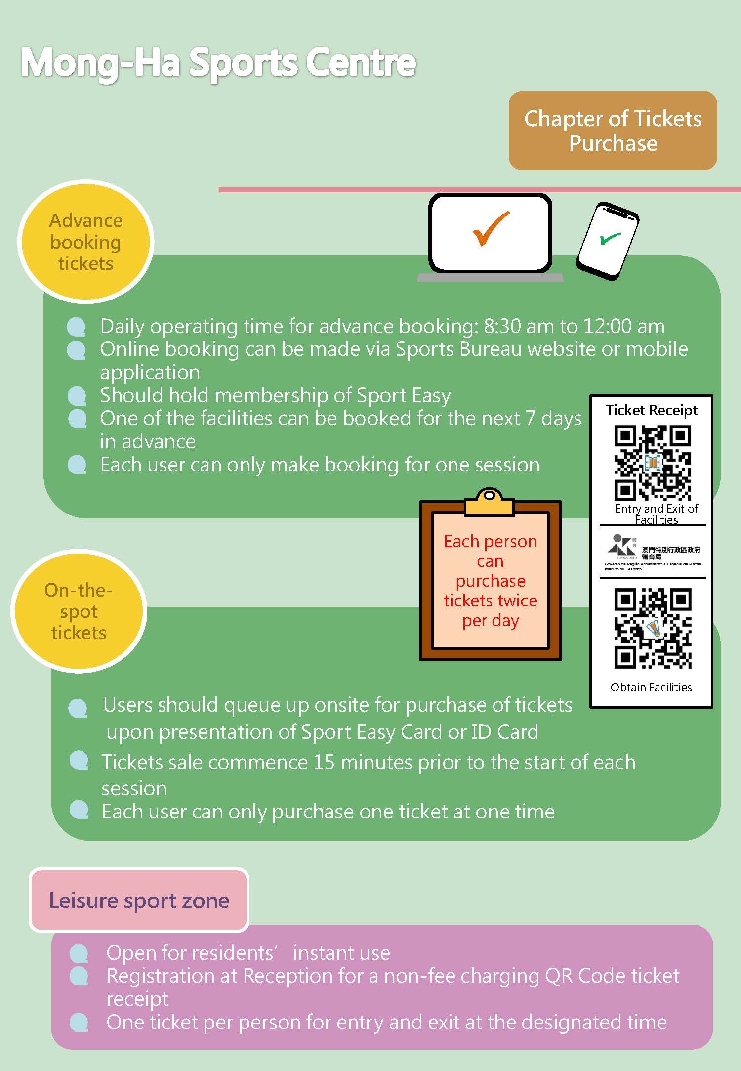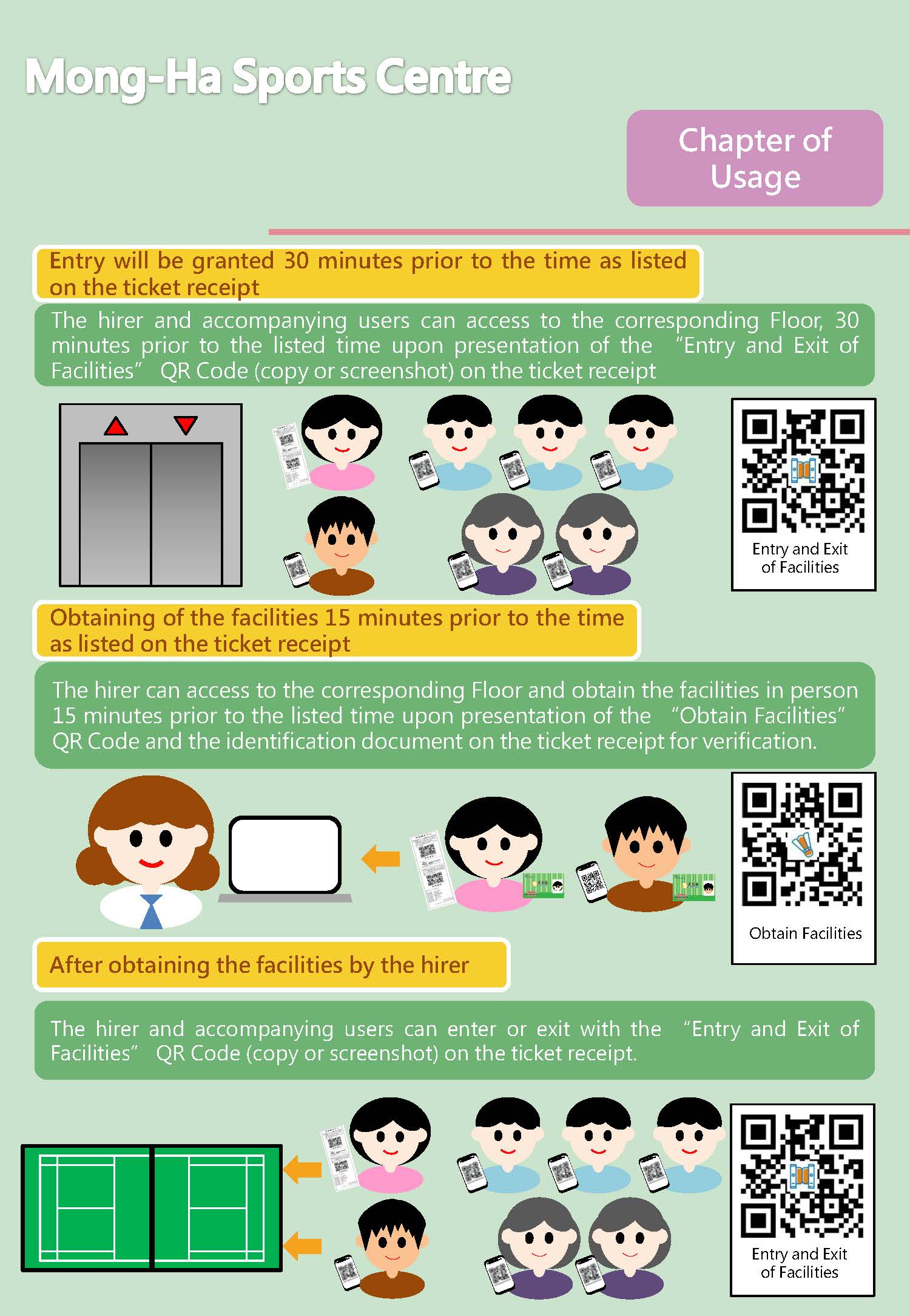 Mong-Ha Sports Centre is a five-storey building that accommodates different sports facilities on each floor. By hosting the most welcomed sports items in the centre, residents are encouraged to nurture healthy lifestyle through having regular exercise in this multi-functional sports venue. In order to facilitate routine exercise planning for the residents, online booking is the main ticketing method at Mong Ha Sports Centre. On the other hand, number of visitors will be limited to avoid crowds and meet with the epidemic control and prevention measures. Therefore, it is suggested that residents should make online reservation at their earliest convenience. After successful reservation, hirer will be given a ticket receipt (electronic or paper) with two QR Codes: “Entry and Exit of Facilities Code” and “Obtain Facilities Code”. First, hirer and companions can scan the “Entry and Exit of Facilities Code” and access to corresponding floor where the rented facility locates 30 minutes before the appointment. Then, hirer is required to present the “Obtain Facilities Code” and valid ID for registration 15 minutes prior to the appointment. Only with successful registration, hirer and companions can enter the venue by once again scanning the “Entry and Exit of Facilities Code”.