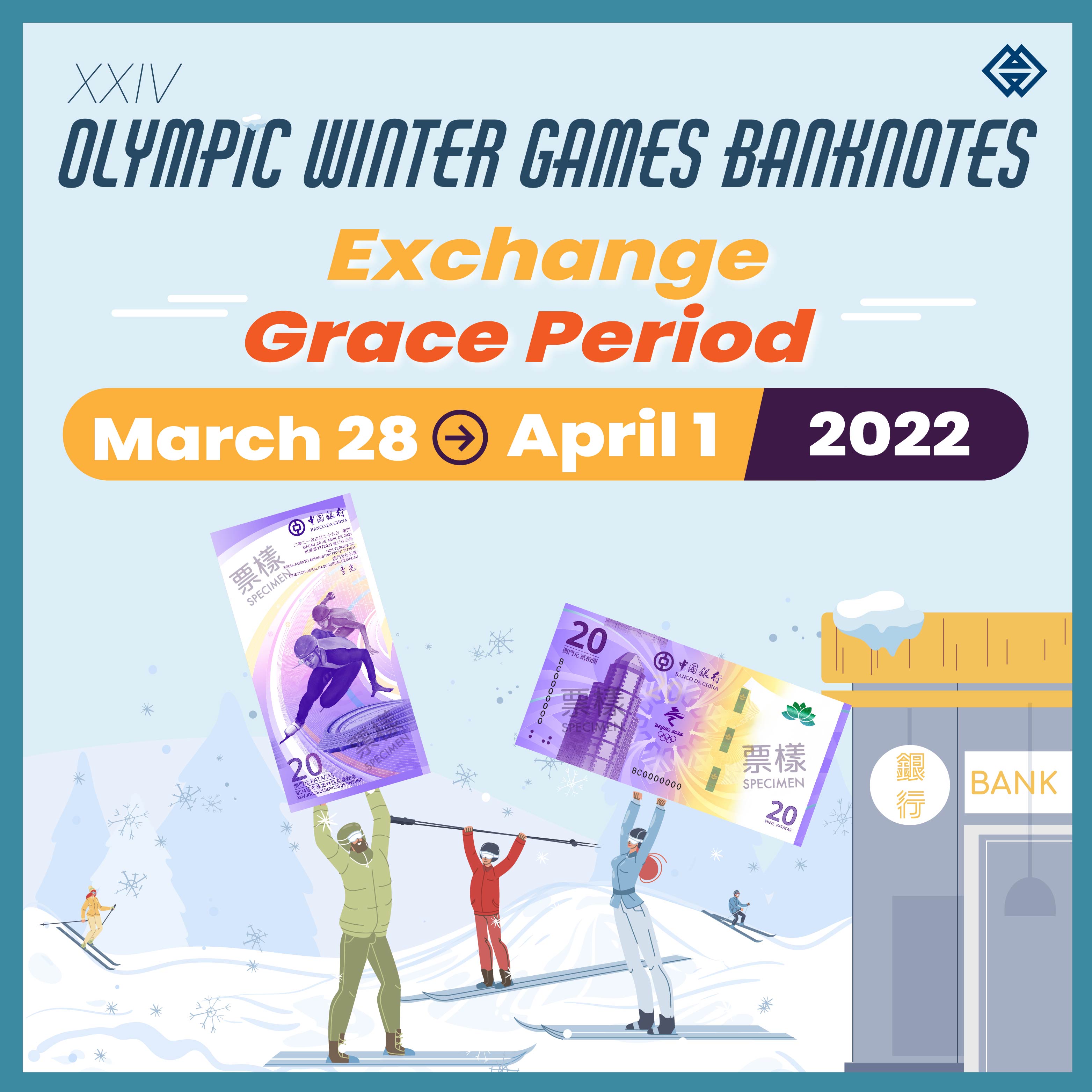 As scheduled, the exchange period for the XXIV Olympic Winter Games banknotes will end on 25 March 2022 (Friday). For the convenience of those registrants who have not yet conducted the note exchange, a grace period will be granted between 28 March 2022 and 1 April 2022 to allow for the exchange of their subscribed notes at their previously selected bank.