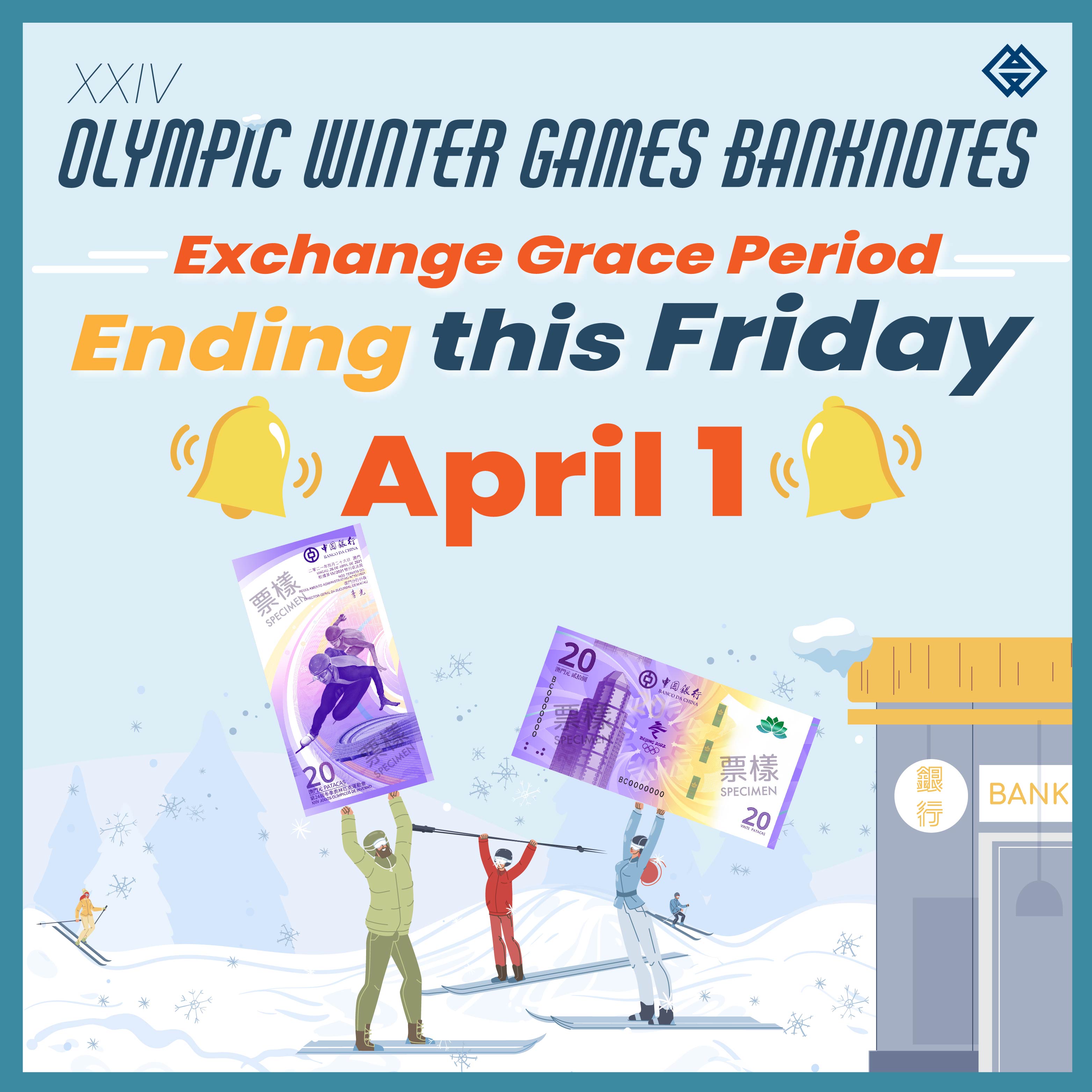 The grace period for the XXIV Olympic Winter Games banknotes will end on 1 April 2022 (Friday). The Monetary Authority of Macao would like to remind those registrants who have not yet conducted the note exchange to exchange for their subscribed notes at their previously selected bank on or before this Friday.
