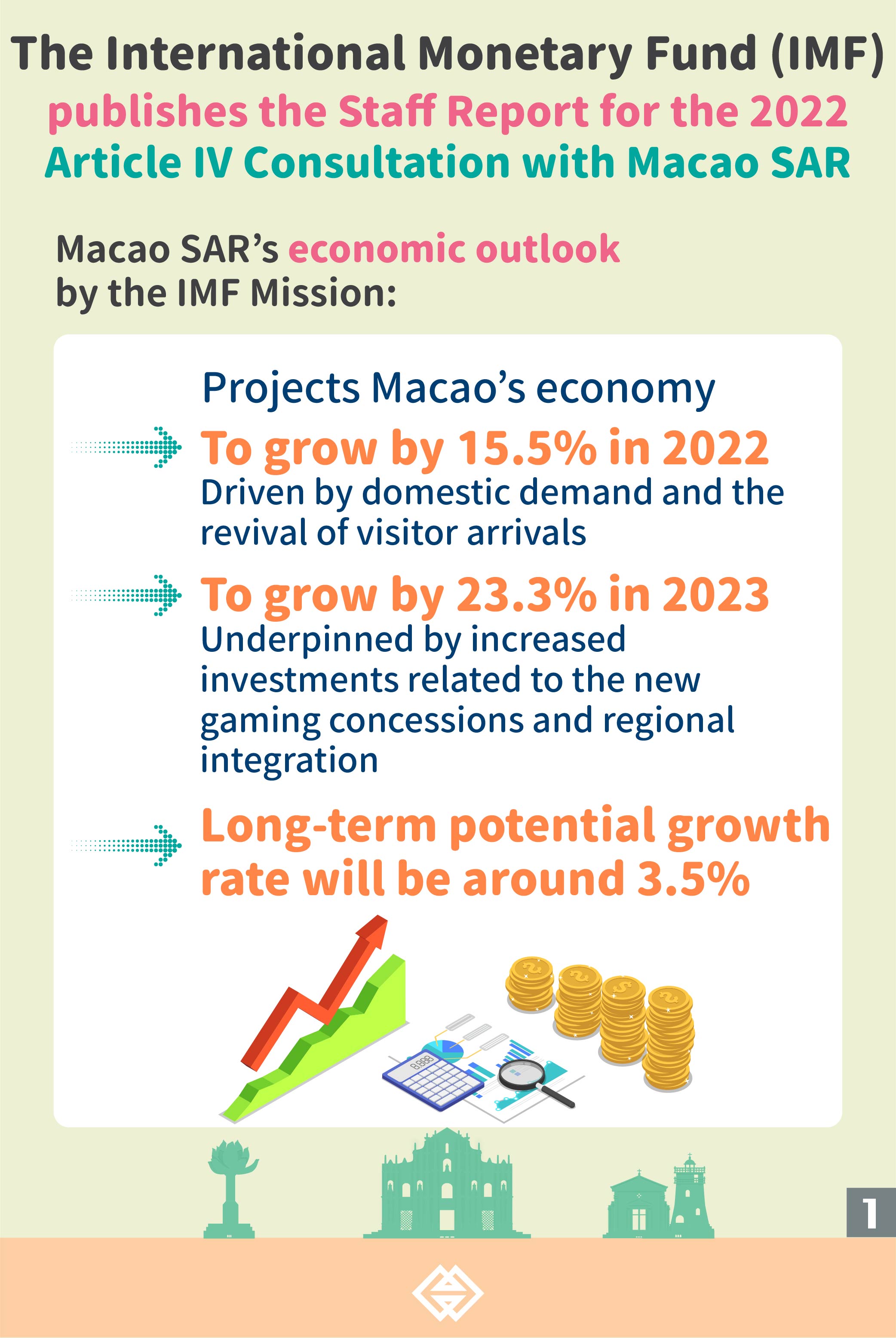 The International Monetary Fund (IMF) concluded the 2022 Article IV Consultation with Macao Special Administrative Region (Macao SAR) and published its Staff Report today (13 April). The Mission affirms Macao SAR Government’s effective deployment of fiscal resources to soften the pandemic’s adverse impact on the economy. Meanwhile, it projects Macao’s economy to grow by 15.5% this year and 23.3% next year.