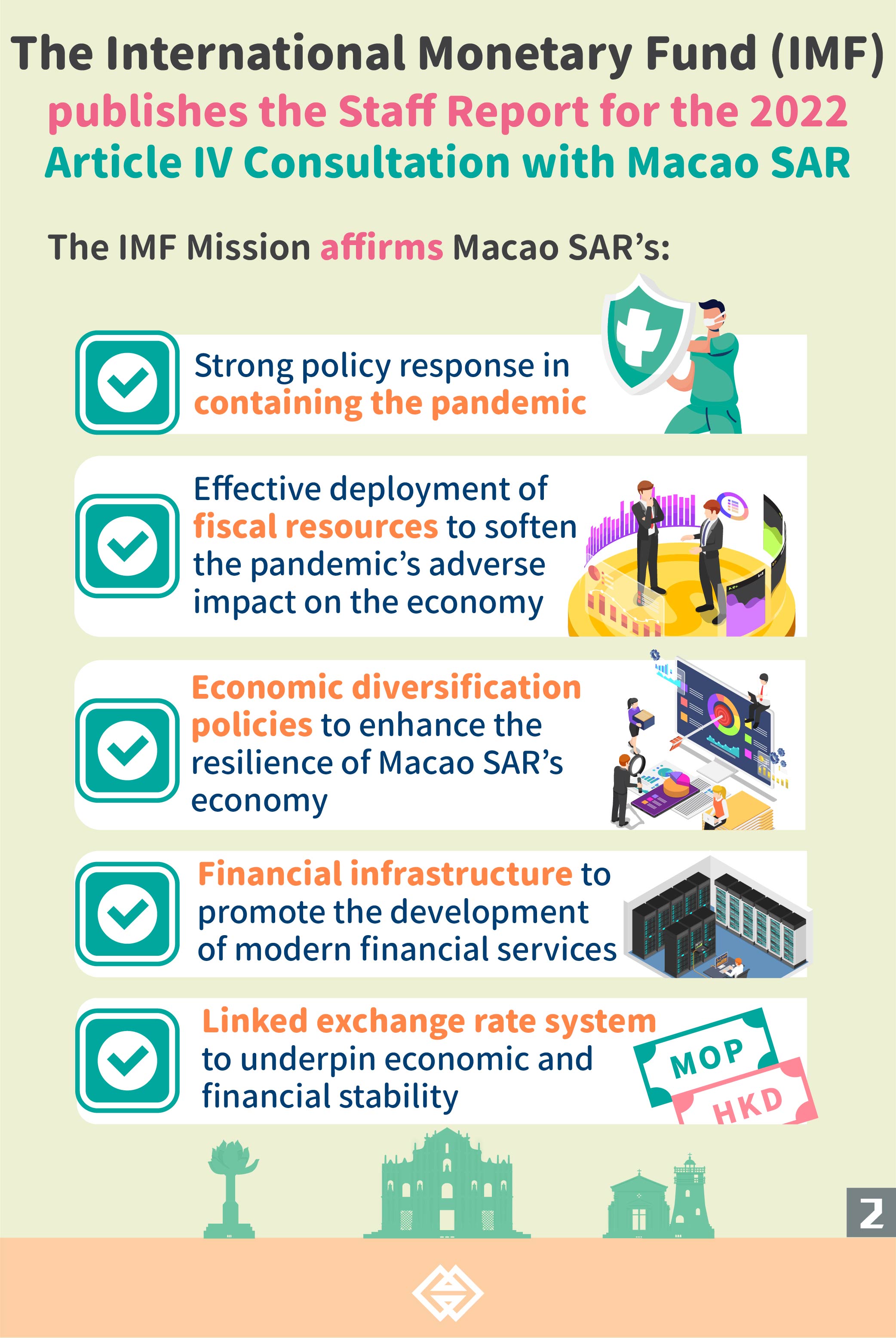 The IMF reaffirms that the linked exchange rate system between the MOP and the HKD underpins Macao SAR’s economic and financial stability, attributable to the implementation of countercyclical fiscal policy as well as maintenance of adequate foreign exchange reserves, a robust banking sector and flexible labour market.