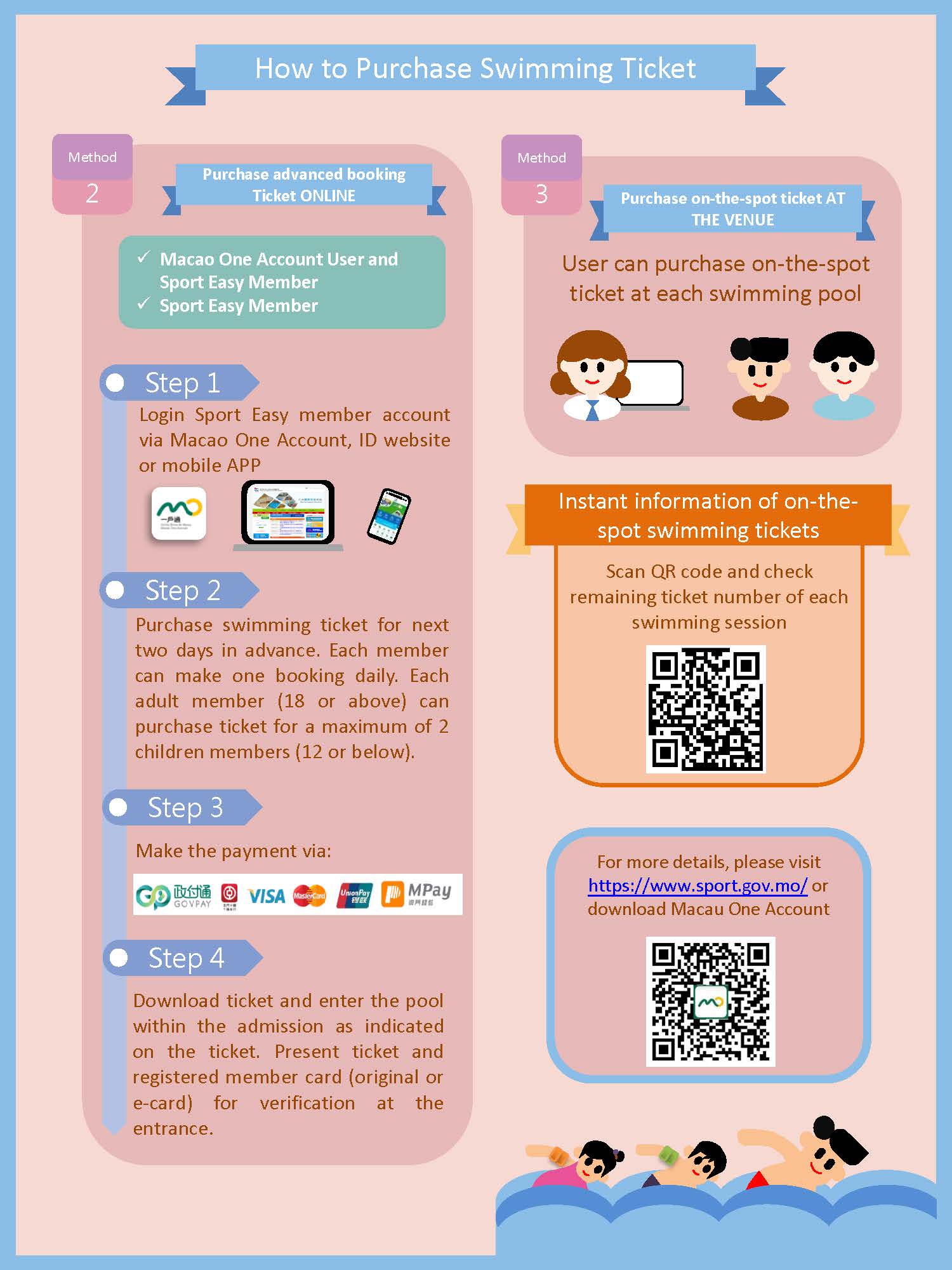 To facilitate the purchase of on-the-spot swimming ticket, with effect from 1 May, ID issues online ticketing service of on-the-spot swimming ticket. Users can purchase on-the-spot swimming ticket 30 minutes before each swimming session begins through the following three channels: “Macao One Account”, ID website and ID mobile APP, shortening their waiting time at the venue. As children aged 12 or below are required to be accompanied by adult aged 18 or above when purchasing ticket and swimming, each adult can add information of a maximum of two children in the online ticketing system.