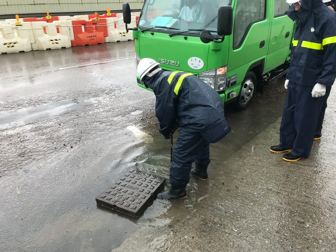 Upon the approach of a typhoon or rainstorm to Macao, the priority is given to inspection and clearance in low-lying areas susceptible to floods. If the yellow rainstorm warning signal or above is issued by the Macao Meteorological and Geophysical Bureau, IAM will activate the rainstorm emergency response team mechanism. Pumps will be turned on remotely for drainage of rainwater according to the real-time height of sea tides; staff will be sent to inspect the operation of rainwater pumping stations; pumps will be adjusted and controlled for speedy flood relief depending on the situations. When tropical cyclone signal no. 8 or a rainstorm warning signal is issued, IAM will send staff to be stationed at major drainage pumping stations. The outsourced emergency drain clearance personnel will be increased to 8 teams with a total of 24 persons, who will assist in the inspection and emergency clearance work in various districts throughout Macao. In addition, IAM has issued letters to the regulatory departments of construction licenses to assist in requesting large construction sites to send staff to be stationed at the sites during the typhoon and rainy season so as to cope with drainage emergencies.
