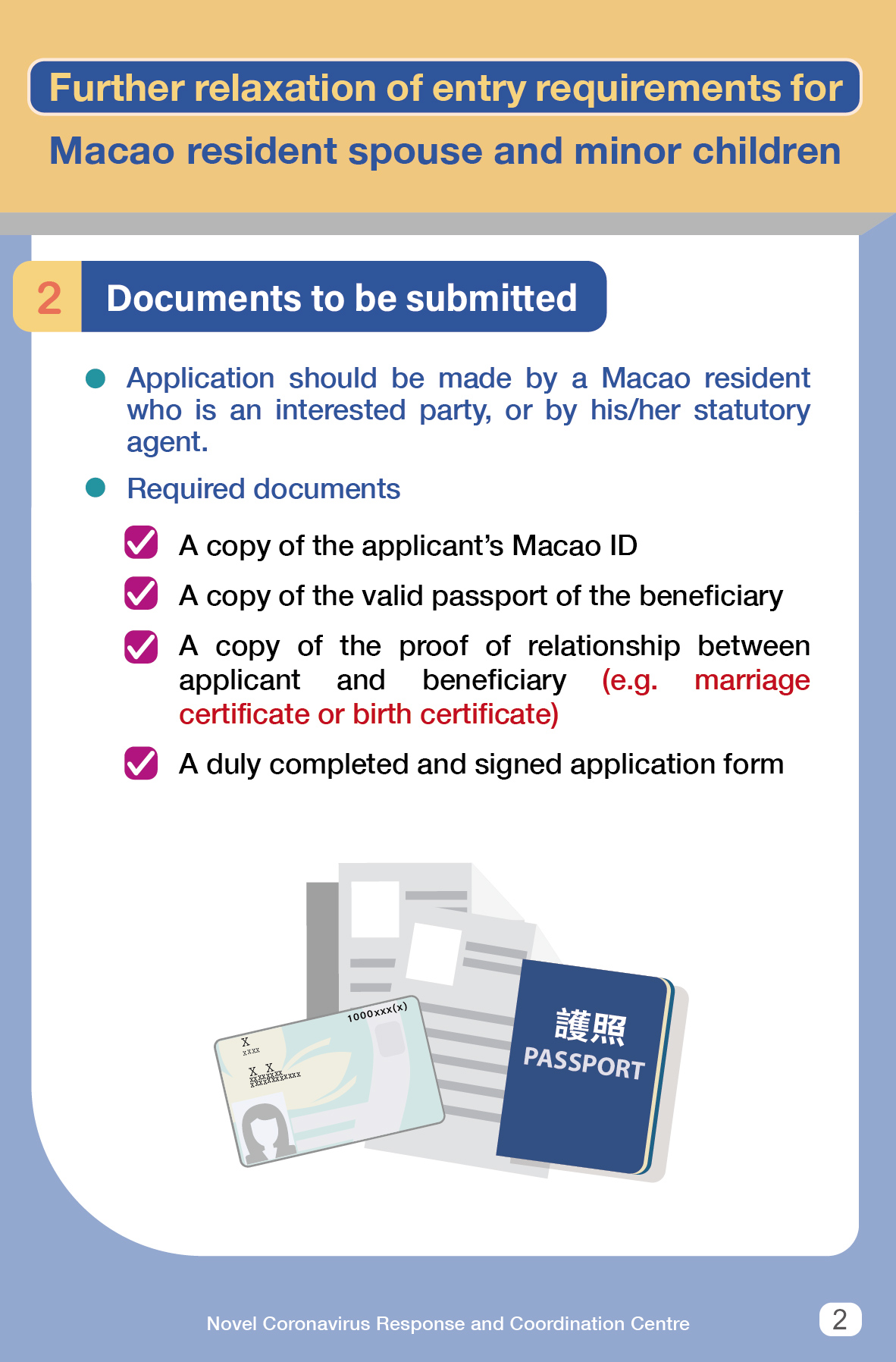 - Documents to be submitted include a copy of the valid Macao resident identity card of the applicant; a copy of the valid passport of the beneficiary, as well as a copy of the proof of relationship between the applicant and the beneficiary (e.g. marriage certificate or birth certificate); and a duly completed and signed application form.