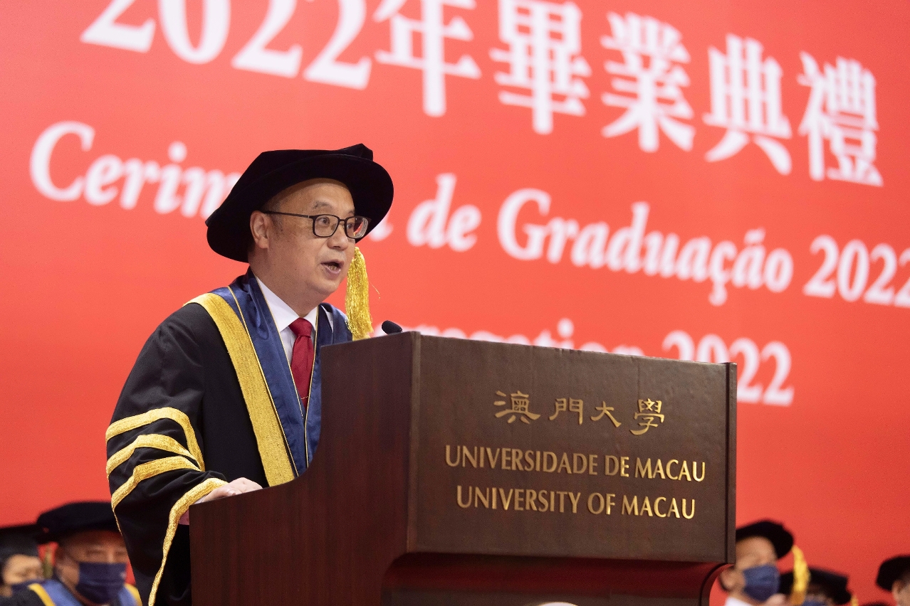 The University of Macau (UM) today (28 May) held the Congregation 2022. Secretary for Social Affairs and Culture Ao Ieong U, representing the chief executive and UM chancellor at this year’s ceremony, said that the university has made great strides in many areas, such as nurturing outstanding patriotic talent for Macao, accelerating research innovation and industry-academia collaboration, as well as setting up joint training programmes and research platforms with mainland institutions, adding that the university’s academic standing and international reputation have been further elevated.