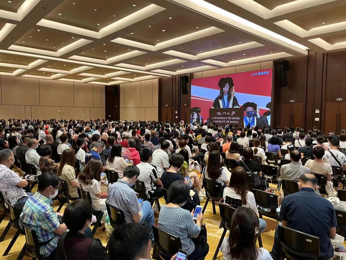 Secretary Ao Ieong officiated at the ceremony in the company of UM University Council Chair Lam Kam Seng, UM Rector Yonghua Song, and Vice Rectors Michael Hui, Rui Martins, Ge Wei, Mok Kai Meng, and Xu Jian. Representatives of the University Assembly, University Council, and Senate, as well as government officials, prominent members of the community, UM faculty and staff, and student representatives also witnessed the ceremony. Companions of graduates attending the ceremony watched the live streaming of the event at four locations on campus, while graduates and their families and friends who were unable to attend the ceremony in person participated in the event online.
