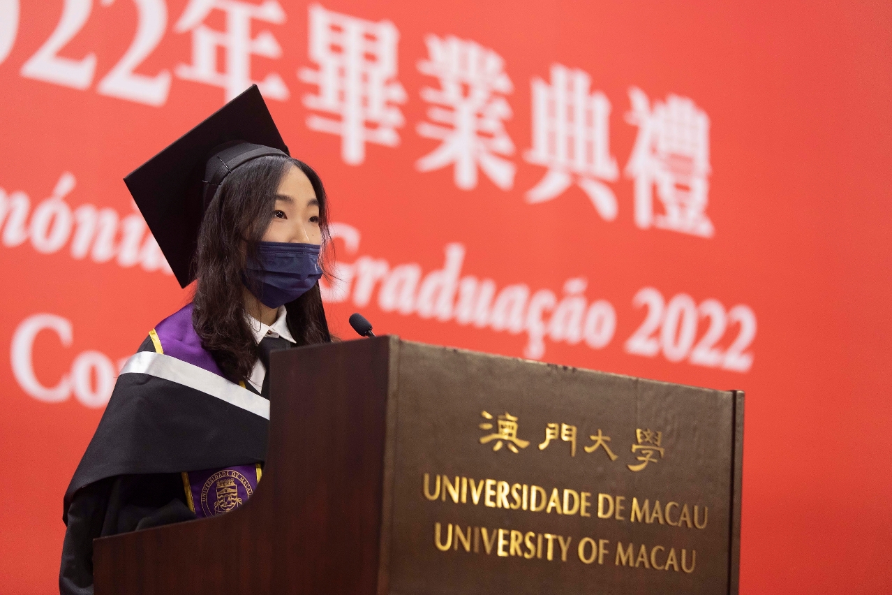 In his speech, Rector Song said: ‘As the administrator of the university, I have had to assume responsibility in the face of the unprecedented difficulties and do my utmost to safeguard the physical and mental health of students, faculty and staff in the midst of a pandemic, while ensuring the smooth operation of the university’s teaching and research. At the same time, I have also continued to improve the talent cultivation system to meet the development needs of the country and the SAR, explore new paths in the mechanism to encourage research innovation and transfer of results and to satisfy market demands, strengthen the university’s social service, and make rational and efficient use of resources to actively promote the development of UM. I am very pleased and also touched that our efforts have received the appreciation, cooperation and support of all our faculty and students, and that all specific areas of work in the university achieved unprecedented synergy, moving forward hand in hand and overcoming difficulties. This unity of purpose and effort has veritably enabled the university to sustain its momentum and enhance its international reputation. It has also given me greater confidence for the future development of the University of Macau!’ Rector Song also shared three ideas with the fresh graduates to encourage them to stay positive and be resilient, to make a mark and say no to ‘lying flat’, and to expand their horizons.