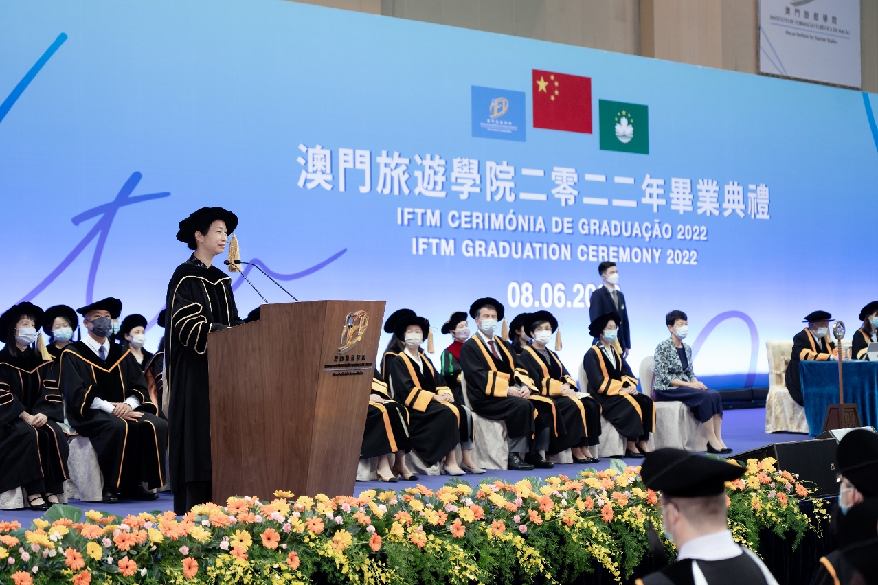 Macao Institute for Tourism Studies (IFTM) held its Graduation Ceremony 2022 at the Tap Seac Multisport Pavilion on 8 June. A total of 468 graduating students of Master of Science (MSc), postgraduate, undergraduate, and diploma programmes received their degrees, embarking on a new journey in life amid the cheers, applause and blessings of the faculty, their relatives and friends, as well as guests from all walks of life.