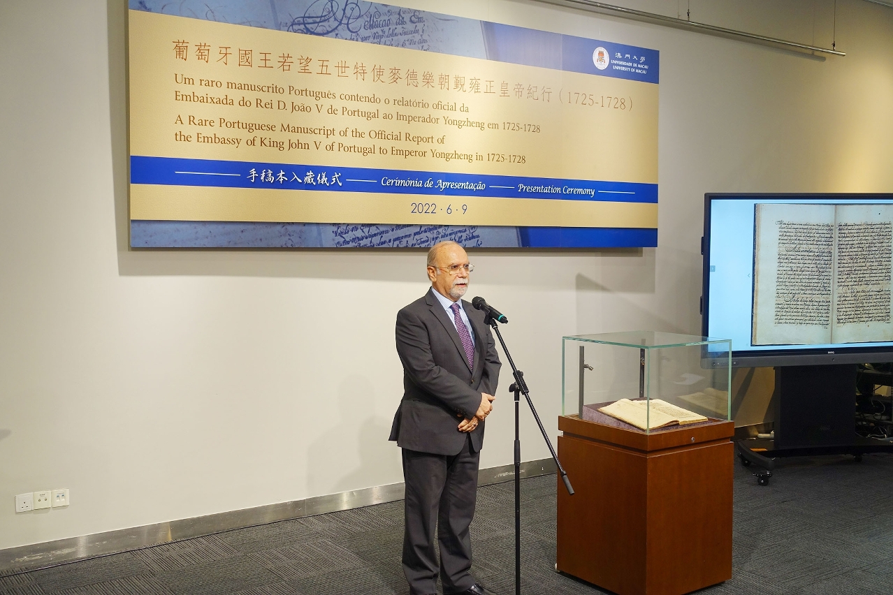 At the ceremony, António Vasconcelos de Saldanha, professor in the Department of History of UM’s Faculty of Arts and Humanities, gave an in-depth explanation on the history and importance of the manuscript. Items displayed during the ceremony included a photocopy of the manuscript, a high-definition photocopy of the letter from King John V of Portugal to Emperor Yongzheng on March 29, 1725, as well as a video from the Ajuda Library on a similar document of the 1727 embassy to Emperor Yongzheng and the Qianlong Emperor’s letter and gift lists to Joseph I of Portugal in 1753.