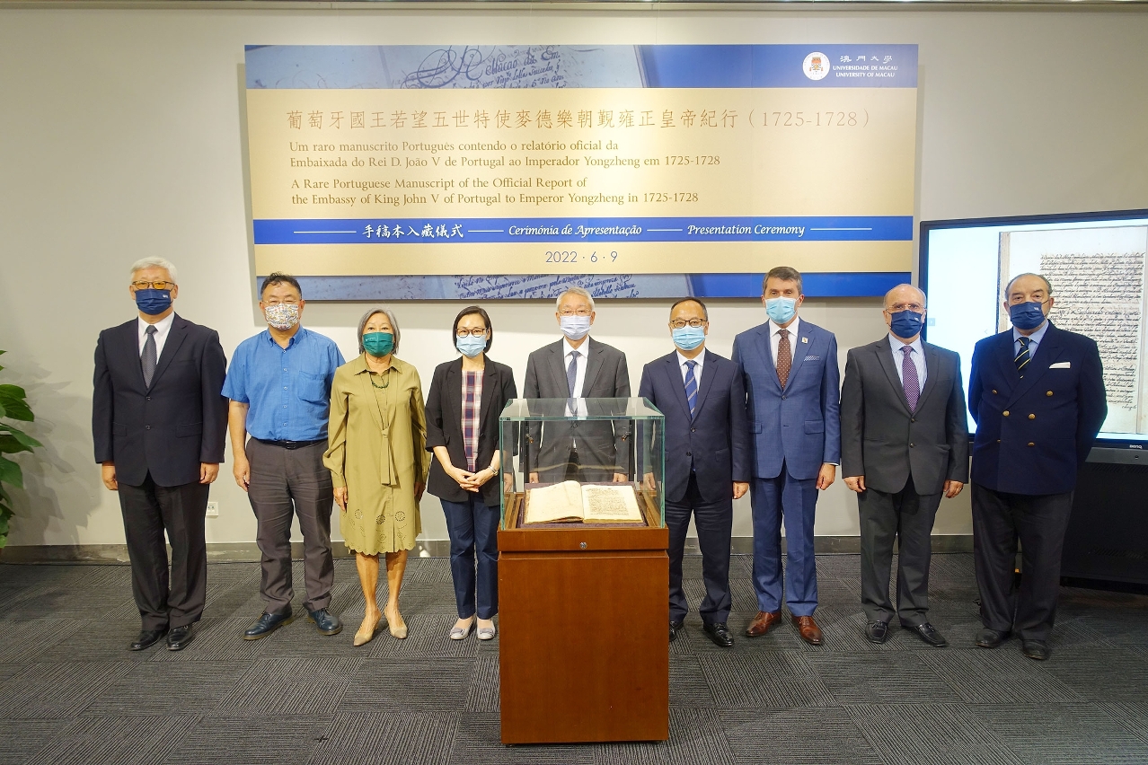 The University of Macau (UM) Library today (9 June) held a preservation ceremony for a rare Portuguese manuscript titled ‘Official Report of the Embassy of King John V of Portugal to Emperor Yongzheng in 1725-1728’. The manuscript, donated by the University of Macau Development Foundation, details the arrival of the Portuguese ambassador Alexandre Metelo de Sousa e Menezes in Beijing via Macao to visit the Yongzheng Emperor and is of great significance to the study of early Sino-Portuguese relations.