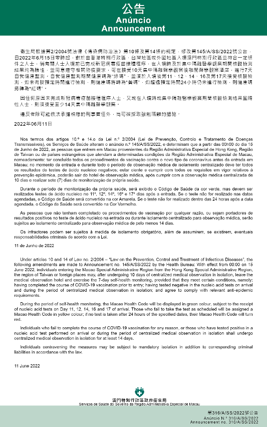 With effect from 00:00 on 15 June 2022, individuals who meet certain conditions and enter the Macao Special Administrative Region from the Hong Kong Special Administrative Region, the region of Taiwan or foreign places will be subject to a "10+7" anti-epidemic measure (i.e. 10 days of centralized medical observation in isolation and 7 days of self-health monitoring). This “10+7” anti-epidemic measure applies to arrivals who meet all the following conditions: