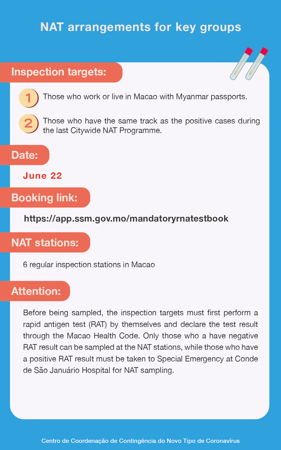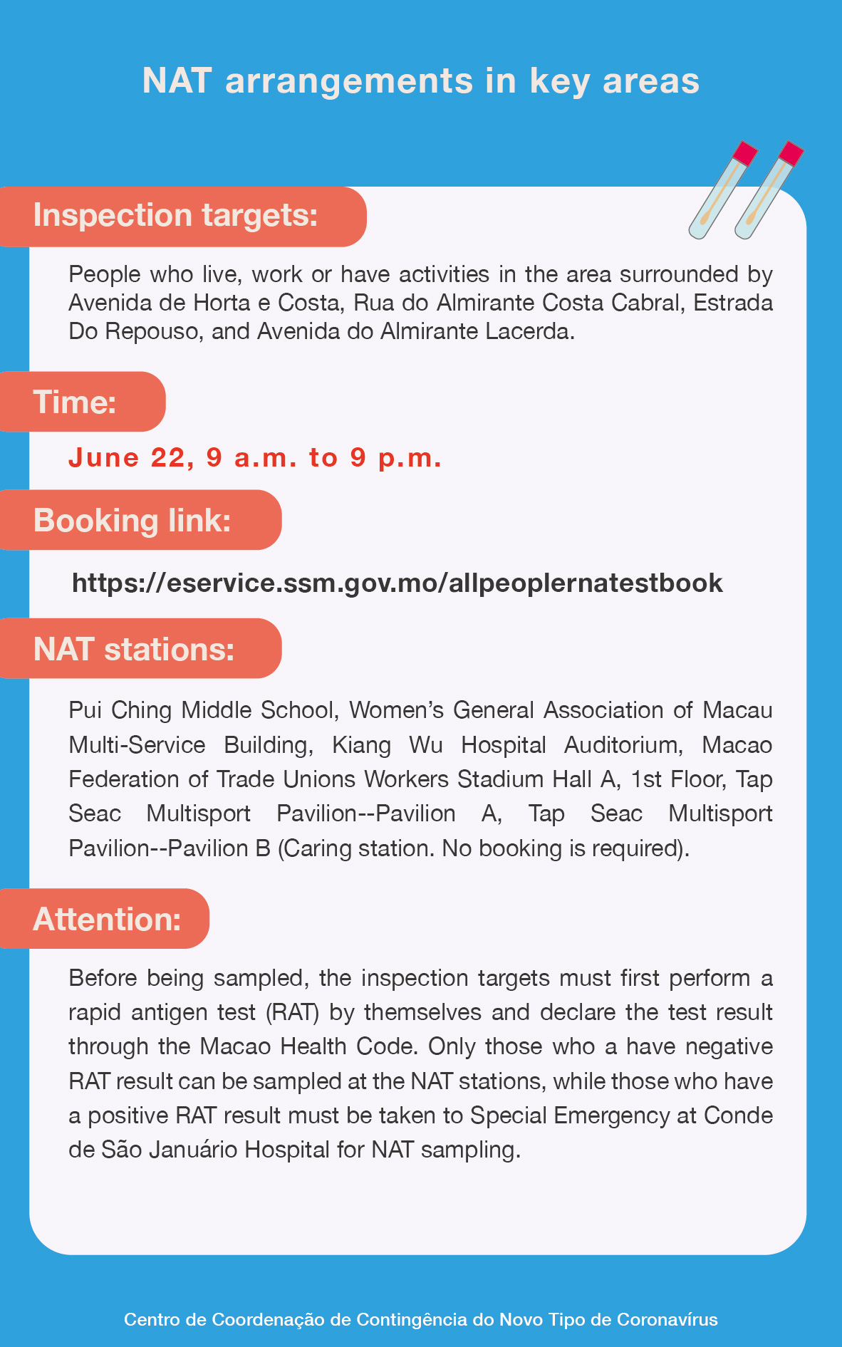 Inspection targets in key areas include: People who live, work or have activities in the area surrounded by Avenida de Horta e Costa, Rua do Almirante Costa Cabral, Estrada Do Repouso, and Avenida do Almirante Lacerda. They must take a NAT at either Pui Ching Middle School, Women’s General Association of Macau Multi-Service Building, Kiang Wu Hospital Auditorium, Macao Federation of Trade Unions Workers Stadium Hall A, 1st Floor or Tap Seac Multisport Pavilion--Pavilion A between 9 a.m. and 9 p.m. on June 22, and the NAT booking link is: https://eservice.ssm.gov.mo/allpeoplernatestbook . Besides, Tap Seac Multisport Pavilion--Pavilion B is also available as a caring station. No booking is required for it.