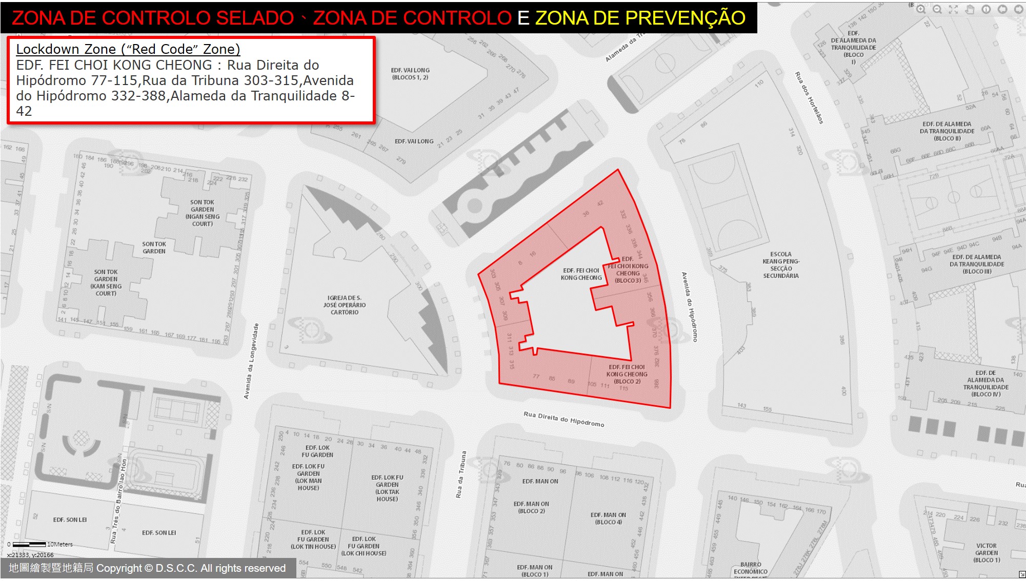 - EDF. FEI CHOI KONG CHEONG: Rua Direita do Hipódromo 77-115,Rua da Tribuna 303-315,Avenida do Hipódromo 332-388,Alameda da Tranquilidade 8-42.