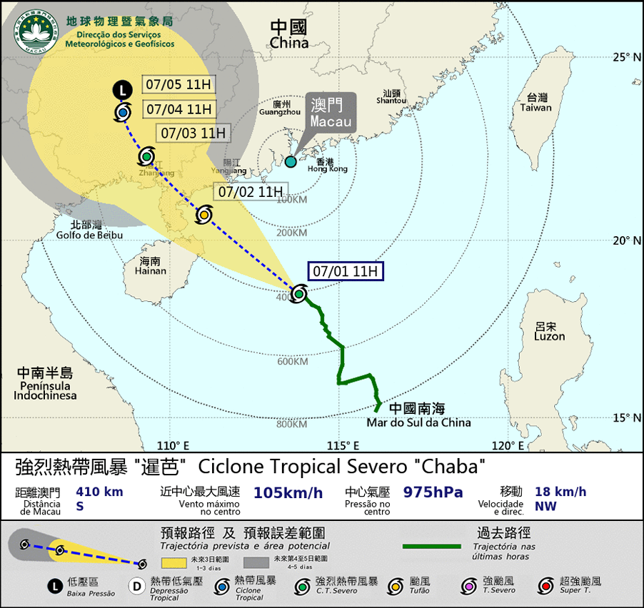 Remarks: The probabilities of issuing severe weather warning signals for the next one or two days are provided in the table. Public can learn the possibility of being affected by the tropical cyclone over the specific period of time in Macao so that necessary precautions can be well prepared earlier. Please keep notice of our latest information.