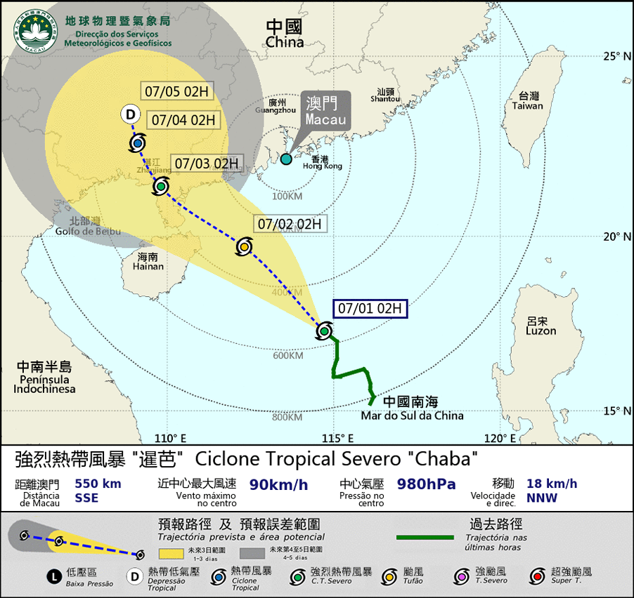 The tropical storm “Chaba” has intensified into a severe tropical storm. “Chaba” is expected to move NW and generally towards the area between the western coast of Guangdong and Hainan Island. Since another low pressure area is expected to develop at the ocean to the east of the Philippines, the intensity and the track of “Chaba” remains uncertain. If it takes a more northward track towards Macao, the possibility of issuing higher signals will increase.