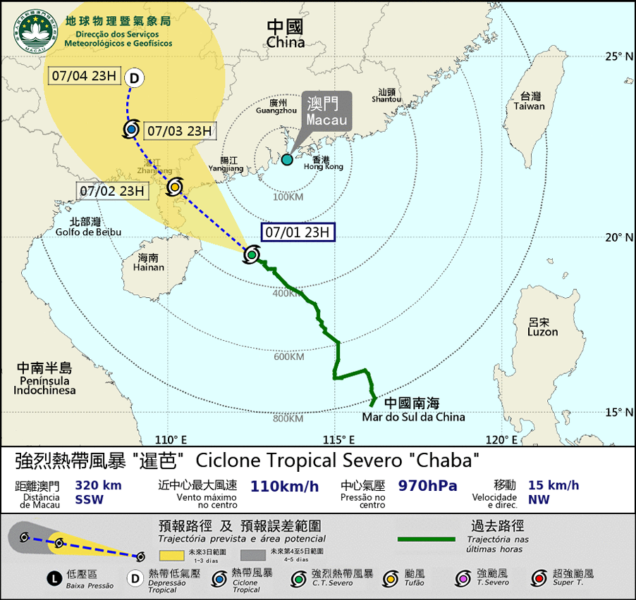 Tropical Cyclone Warning Signal No.8SE is currently in effect. As “Chaba” is expected to intensify into a typhoon, and move northwest and towards the western coast of Guangdong. It will move closest to Macao during the night of the 1st and the morning of the 2nd.