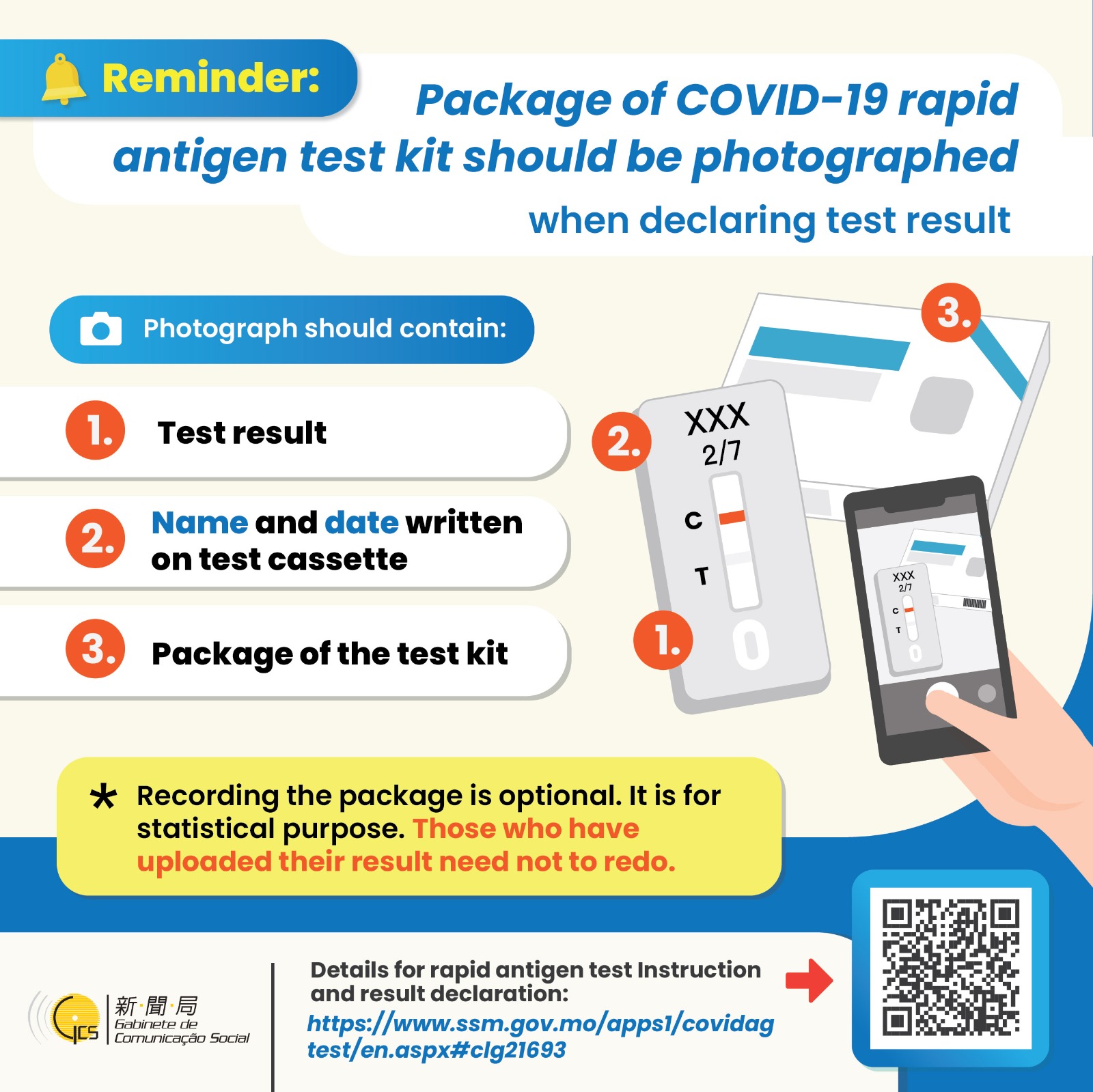 • Package of COVID-19 rapid antigen test kit should be photographed when declaring test result.