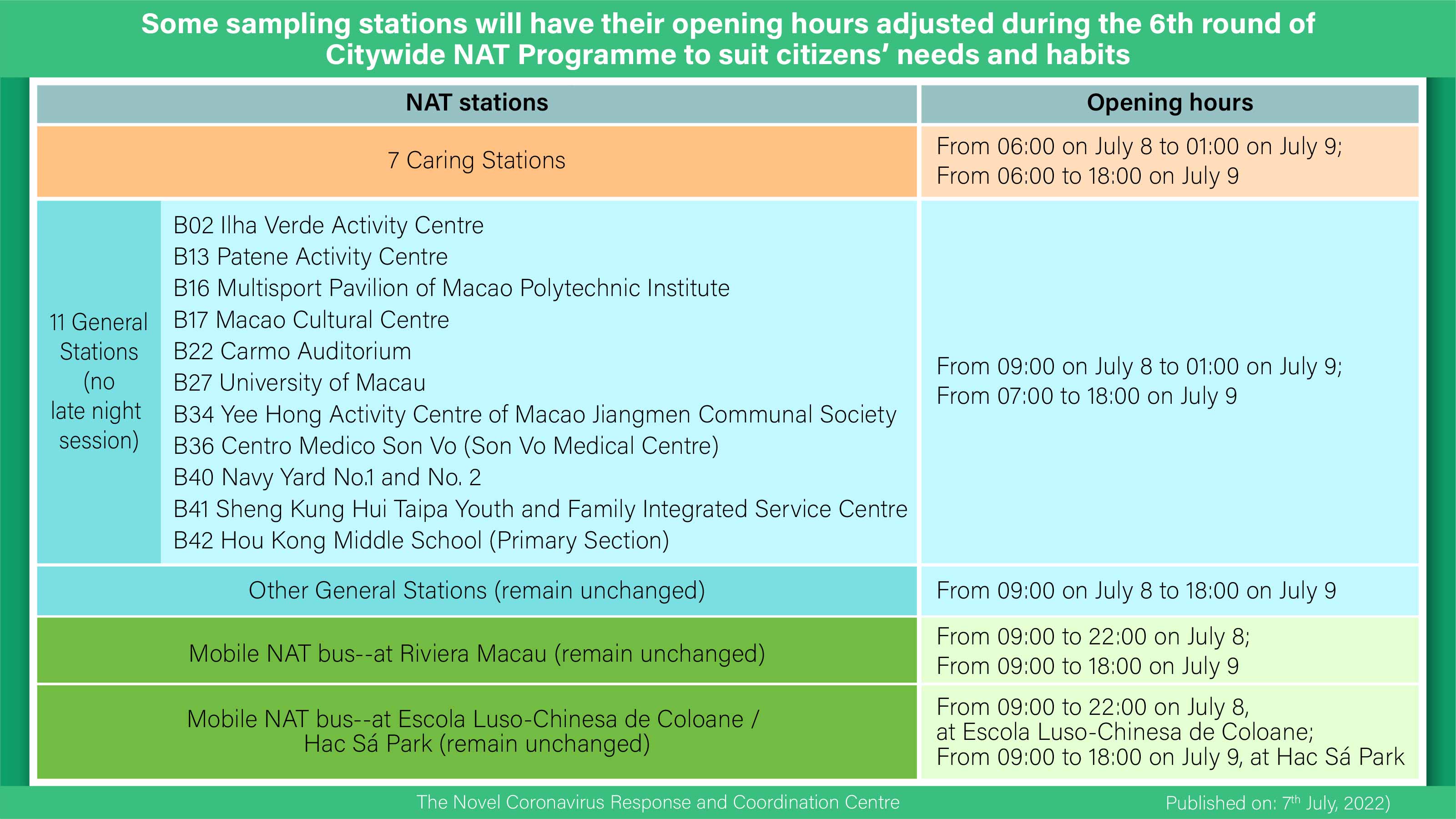 The Novel Coronavirus Response and Coordination Centre stated that, the 6th round of Citywide NAT Programme will take place between 09:00 on July 8 (Friday) and 18:00 on July 9 (Saturday). The booking system (https://eservice.ssm.gov.mo/allpeoplernatestbook) will open at 07:00 tomorrow (July 8). There are altogether 63 NAT stations in Macao, while after analysing the data of citizens’ booking time, the opening hours of some of the NAT stations will be adjusted to suit citizens’ needs and habits. All citizens please take note of such adjustment.