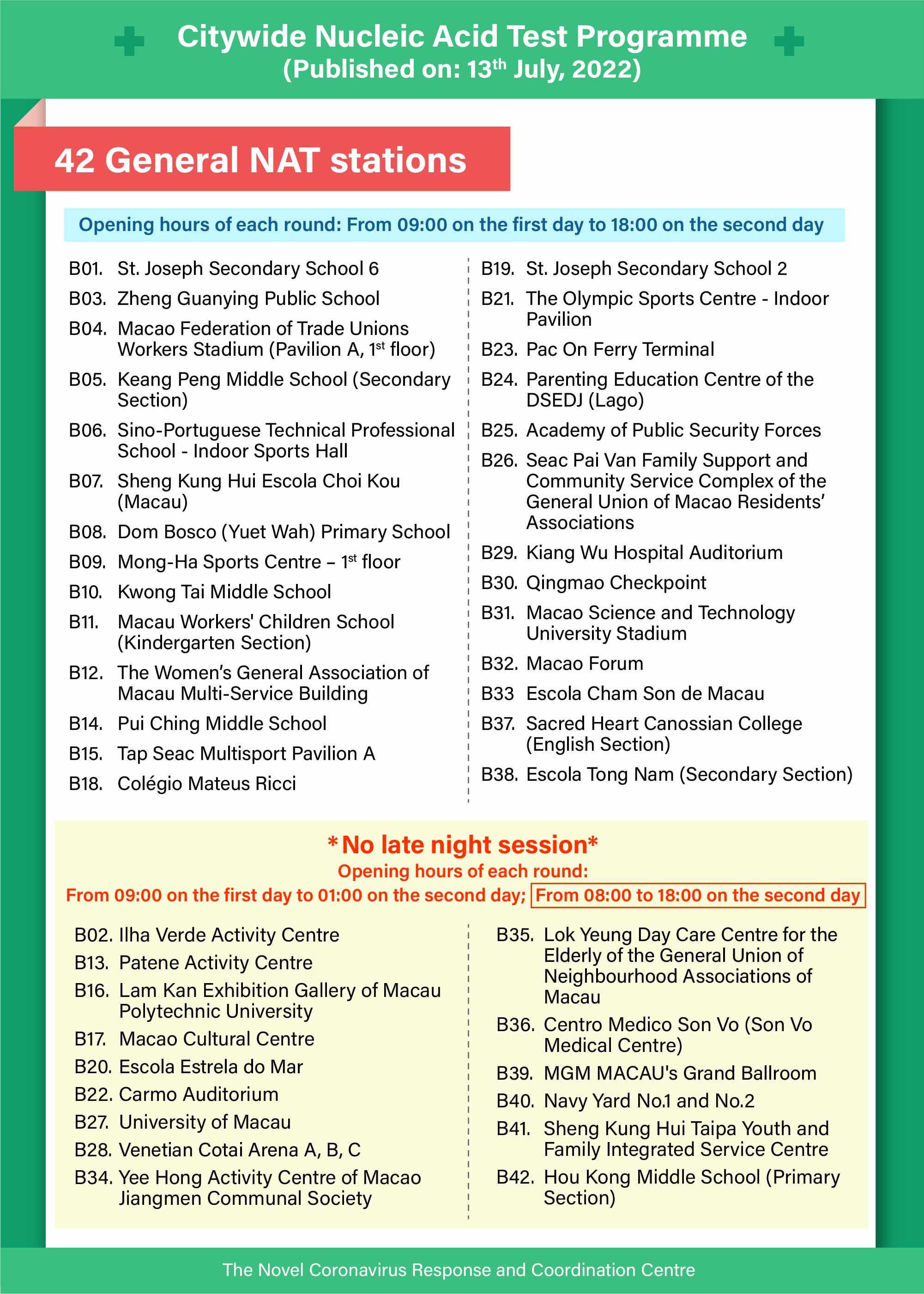 Apart from the above, 4 more General Stations, namely B20 Escola Estrela do Mar, B28 Venetian Cotai Arena A, B and C, B35 Lok Yeung Day Care Centre for the Elderly of the General Union of Neighbourhood Associations of Macau, and B39 MGM MACAU - Grand Ballroom, will also cancel the late night session (see annexed table for details), and will uniformly open from 09:00 on 14 July to 01:00 on 15 July, and from 08:00 to 18:00 on 15 July; the other General Stations will have their opening hours remain unchanged.