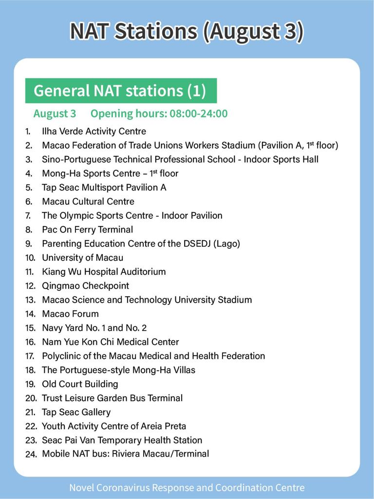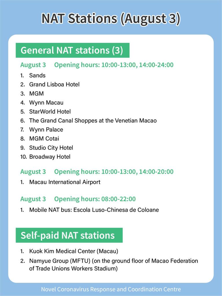 | Self-paid sampling stations (prior booking is required; result will be uploaded to Macao Health Code and paper report can be provided) |