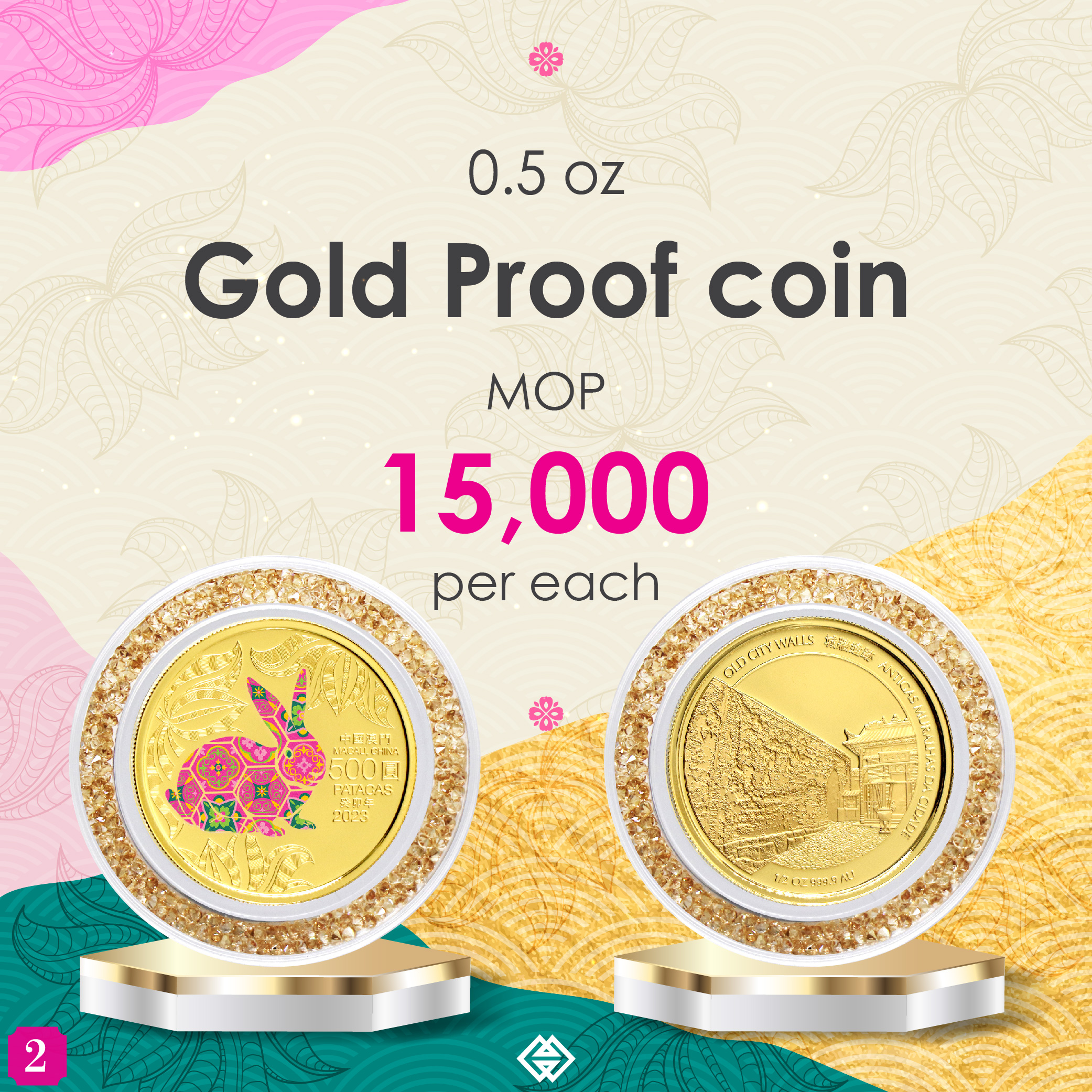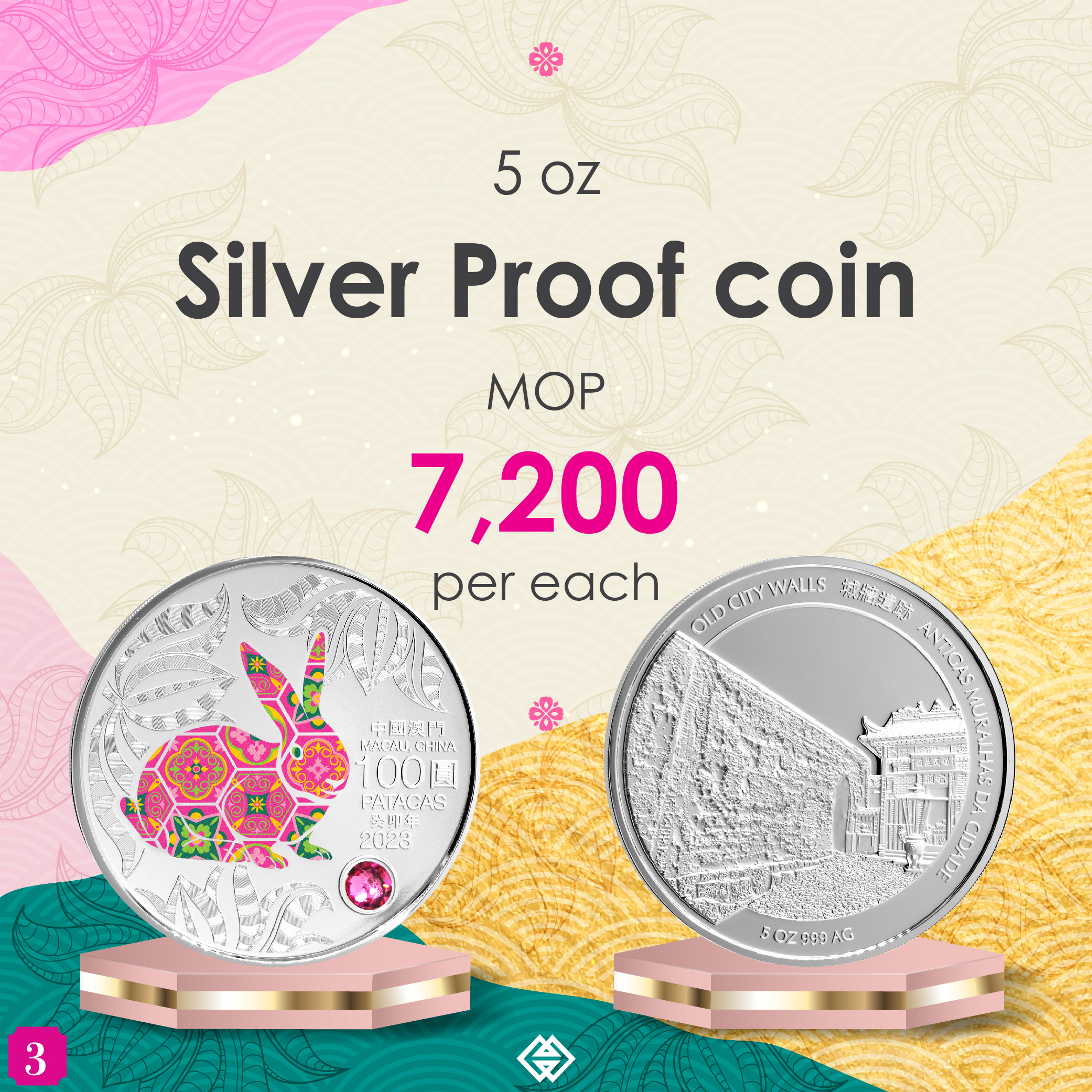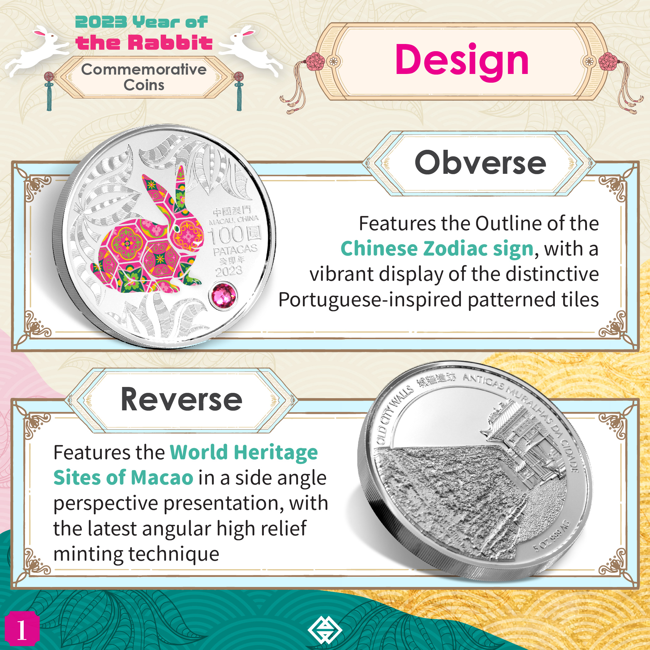 The obverse design of 2023 Year of the Rabbit commemorative coins features the outline of the Chinese Zodiac sign, portrayed with a vibrant display of the distinctive Portuguese-inspired patterned tiles. The reverse design features a World Heritage Site of Macao in a side angle perspective presentation, sculpted in the latest angular high relief minting technique. The Year of the Rabbit commemorative coins comprise a 1 oz and a 5 oz Silver Proof coin as well as a 0.5 oz Gold Proof coin. The selling price of the coins is MOP1,230, MOP7,200 and MOP15,000 respectively.