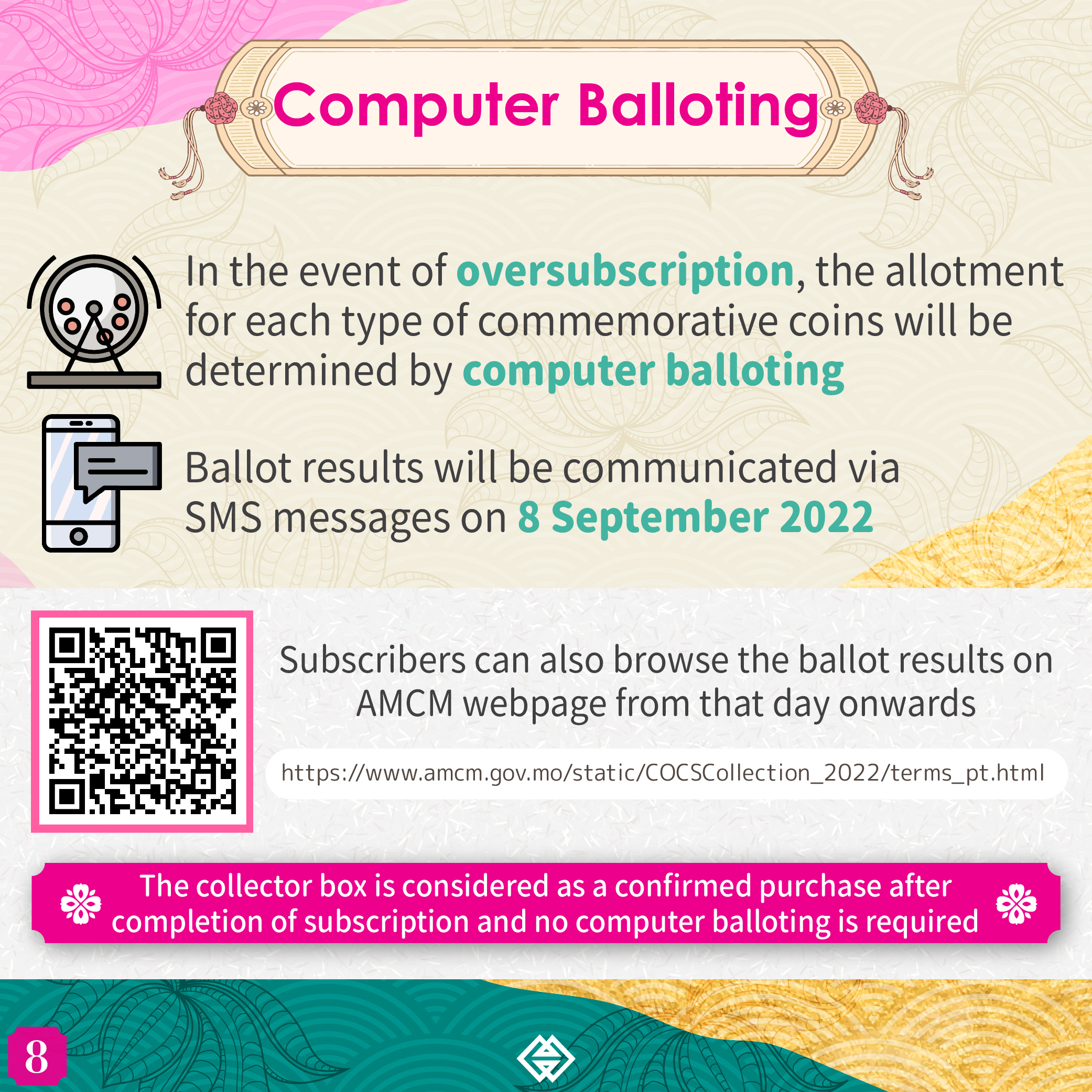 Each subscriber can only conduct a single subscription. In the event of oversubscription, the allotment for each type of commemorative coins will be determined by computer balloting. Ballot results will be communicated via SMS messages on 8 September 2022. Subscribers can also browse the ballot results on AMCM webpage from that day onwards. Meanwhile, the collector box is considered as a confirmed purchase after completion of subscription and no computer balloting is required.