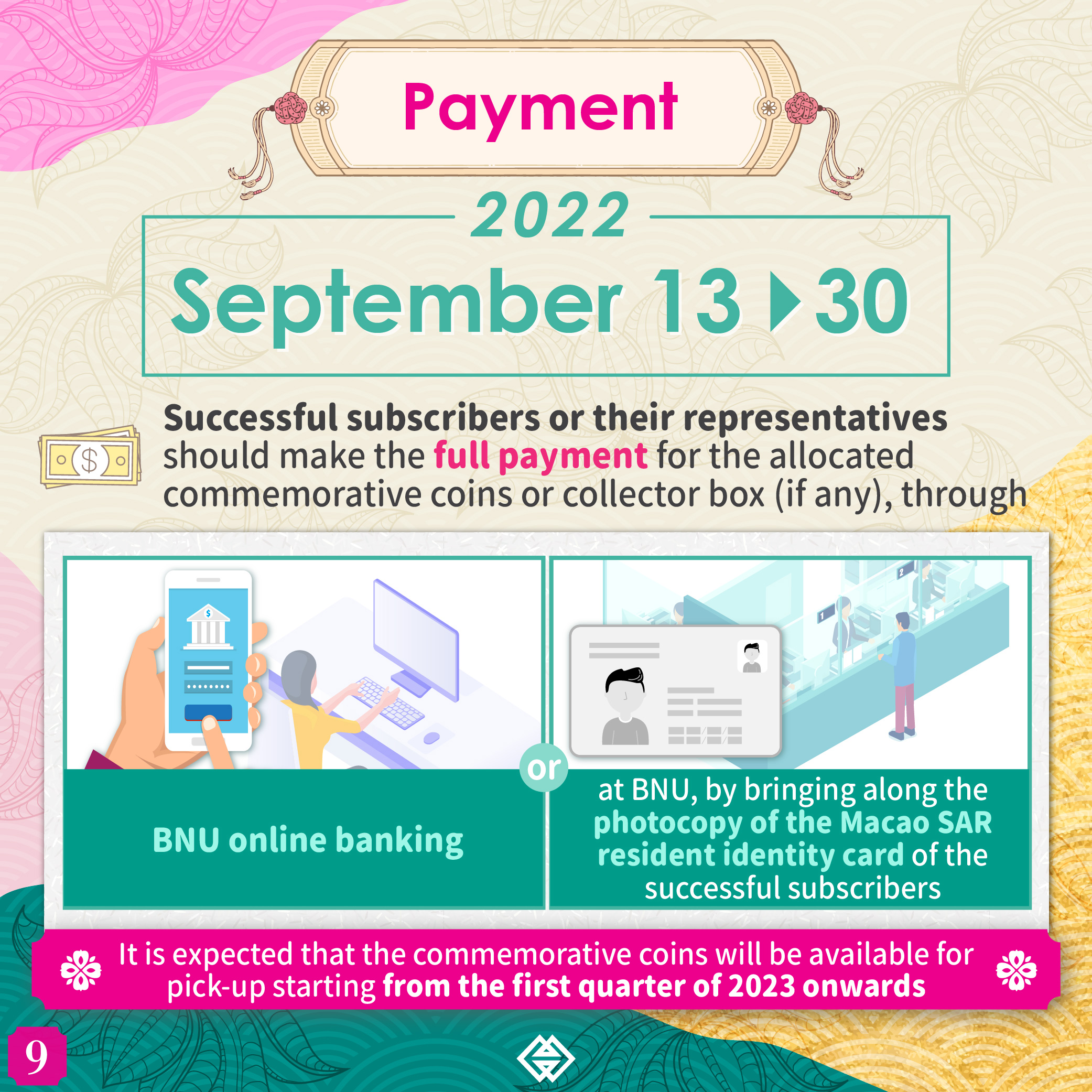 Successful subscribers or their representatives should make the full payment for the allocated commemorative coins or collector box (if any) between 13 September and 30 September 2022, through BNU online banking or at Banco Nacional Ultramarino, S.A., by bringing along the photocopy of the Macao SAR resident identity card of the successful subscribers. It is expected that the commemorative coins and collector box will be available for pick-up starting from first quarter of 2023 onwards.