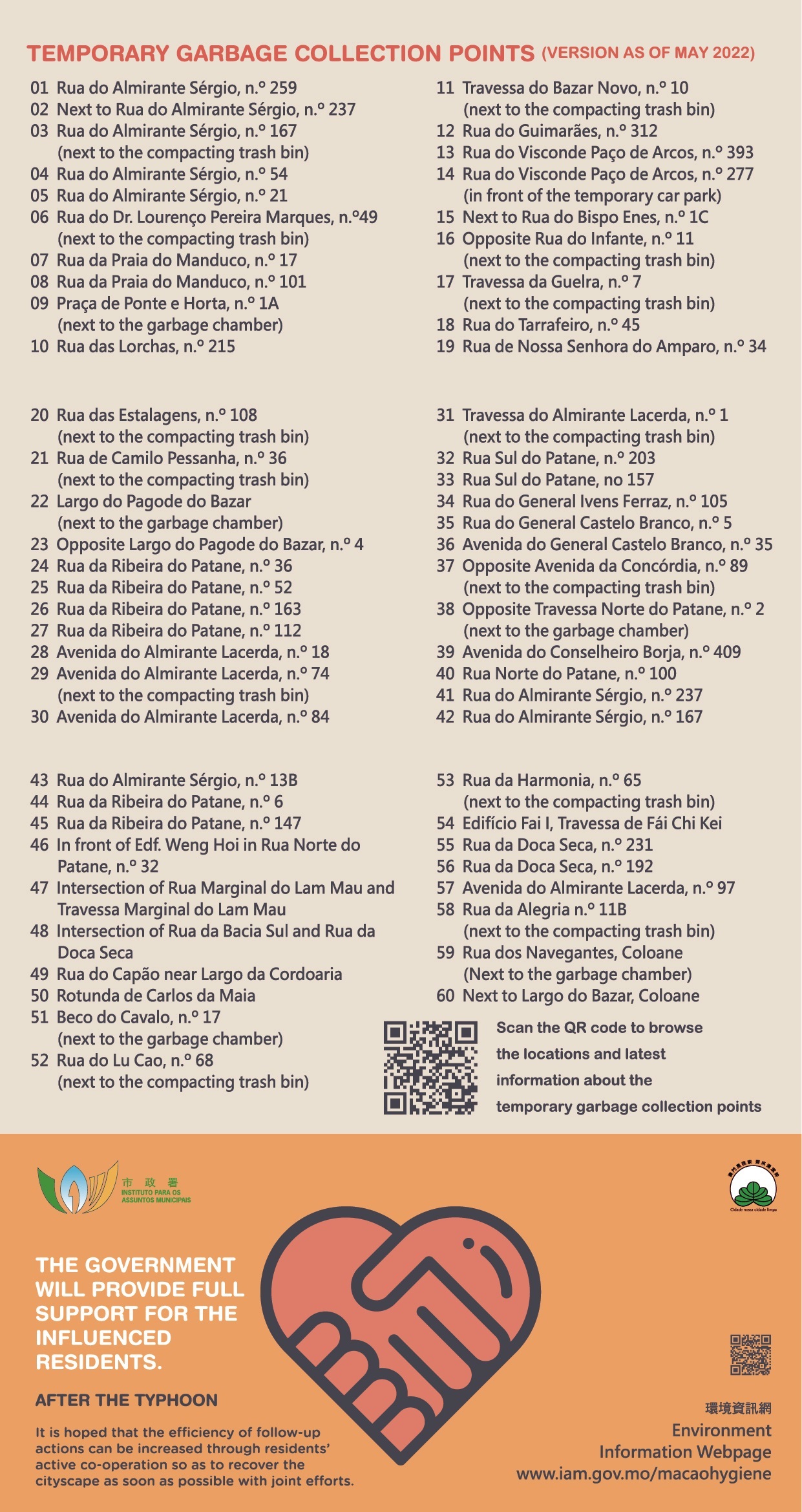 As Tropical Storm “Ma-on” is approaching Macao and is expected to bring unstable weather, the Municipal Affairs Bureau (IAM) has coordinated with the Macau Residue System Company, Ltd. to develop a preliminary plan for the garbage clearance work before and after the typhoon, and has also strengthened its communication with the neighbourhood associations of low-lying areas. IAM calls on the public to cooperate with the measures, not to dispose of domestic waste during the storm, and to dispose of bulky garbage only after the peak period of garbage collection, so as to avoid increasing the burden of garbage clearance.