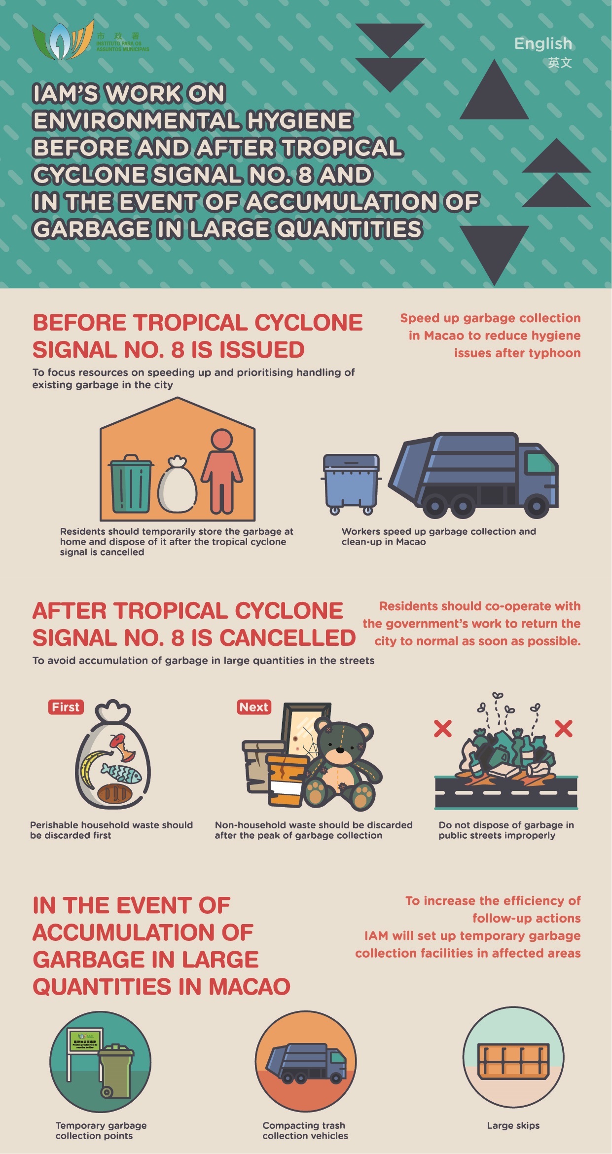 IAM calls on the public to cooperate with the measures and store the domestic waste at home before the Tropical Cyclone Signal number 8 is issued, dispose of it after the typhoon, and dispose of bulky garbage after the peak period of garbage collection, so as to avoid obstructing traffic or affecting the garbage collection and clearance work. Besides, IAM carries out regular inspections of advertisement signboards. Whenever the Tropical Cyclone Signal number 1 is in force in Macao, IAM sends mobile phone SMS notifications to all the license holders of advertisement signboards, reminding them to pay attention to the status of their signboards, in order to safeguard public safety.