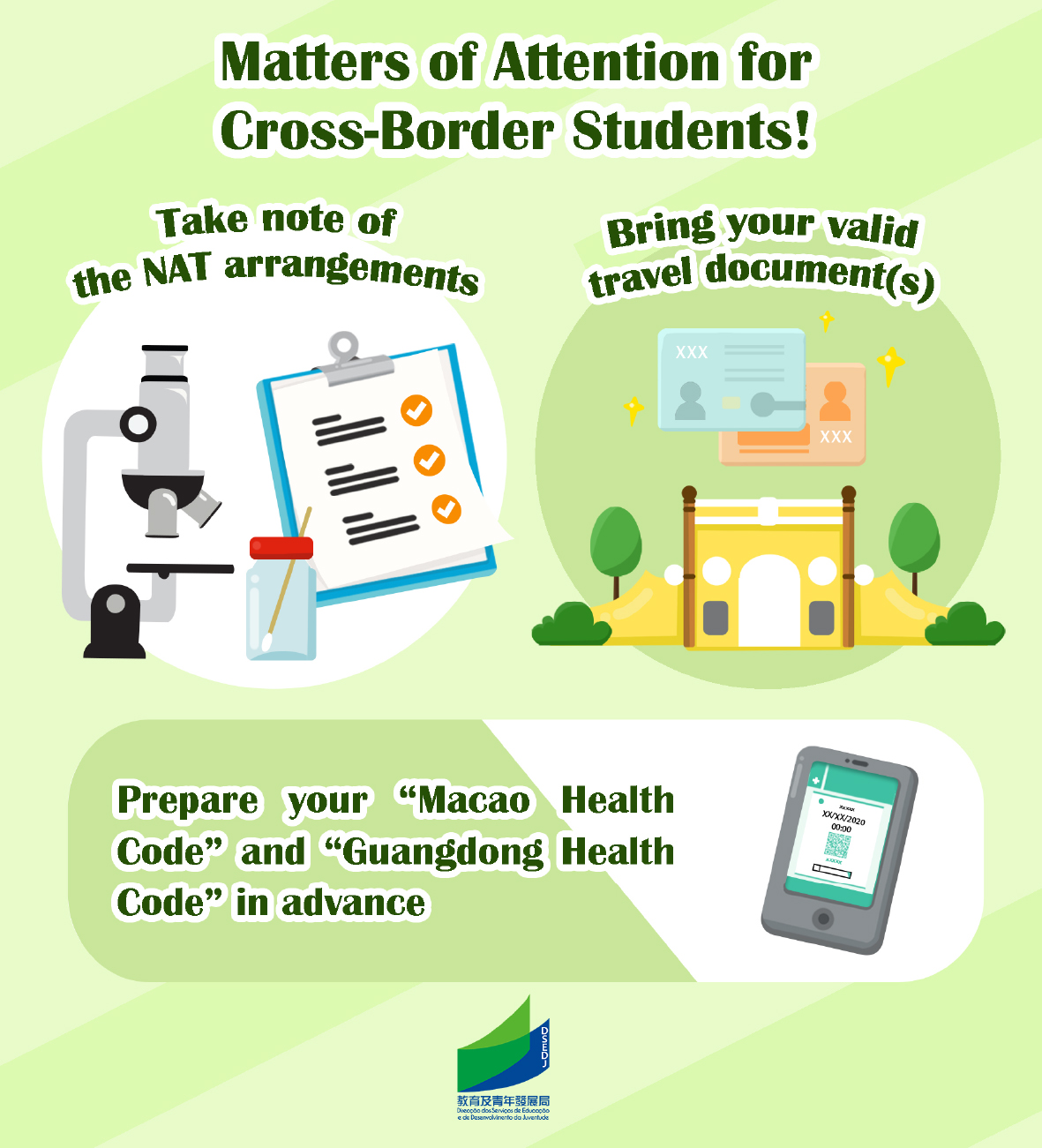 In order to ensure the health and safety of teachers and students, the DSEDJ announced in early August that students and teaching staff of tertiary education institutions and non-tertiary education schools were required to return to their usual place of residence (Macao, Zhuhai or Zhongshan) 10 days before the first day of the new academic year. They also have to present a nucleic acid test certificate within 72 hours (3 days) on the school opening day. In order to facilitate their booking for the test, "COVID-19 Nucleic Acid Test Booking System for Teachers and Students" ( https://app.ssm.gov.mo/studentrnabook ) has been opened. It is necessary for all teachers and students to make an appointment in advance. It is suggested that they should not arrive the test station too early (over 30 minutes earlier) or too late to avoid big crowds. The test result cannot be used to cross the border, nor can it be used as regular testing for key working groups. Cross-border students and teaching staff only need to undergo a nucleic acid test in Zhuhai or Zhongshan; there is no need for them to come back to Macao to do the test again. In addition, faculty and students of tertiary education institutions and teaching staff of non-tertiary education schools have to present to the institution or school a certificate of completion of the entire course of vaccination against COVID-19, or show a proof of negative result of nucleic acid test for COVID-19 within 7 days every week.