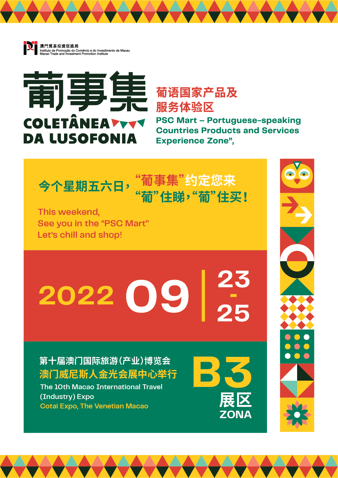 In addition, IPIM will showcase more than 140 featured products and handicrafts from nine PSCs on-site. The “Popular Slangs Wall” and the “Let’s Hang Out” Mascots Photo Booth will also be set up at the venue to create a joyful vibe for visitors to experience the products and cultures from China and Portuguese-speaking countries, and learn more about Macao’s role as a China-PSC platform. In the meantime, personnel will be stationed at the venue to introduce participants to the “China-PSC Business Compass” service and the “Economic and Trade Co-operation and Human Resources Portal between China and Portuguese-speaking Countries”, facilitating Macao SMEs’ market expansion via the MICE platform.
