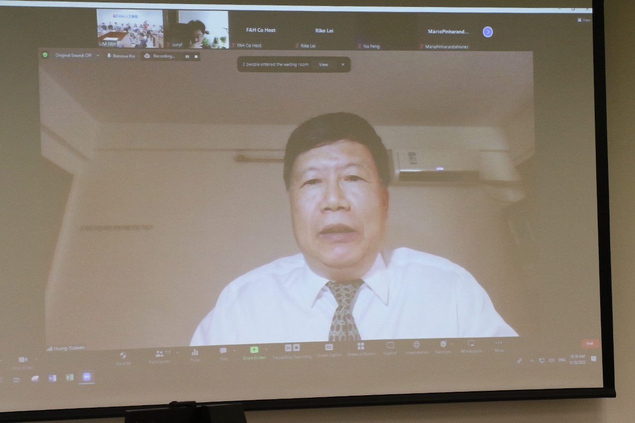After the lecture, UM faculty members and students, as well as online participants, had a discussion on the theme with Prof Huang. Xu Jie, dean of the FAH, and Joaquim Kuong, assistant dean of the FAH, also participated in this forum. Held every academic year, the forum aims to provide a platform for world-renowned scholars from different humanities fields to share their latest research results with the UM community and local teachers and students. This is the first lecture of the forum in the 2022/2023 academic year.
