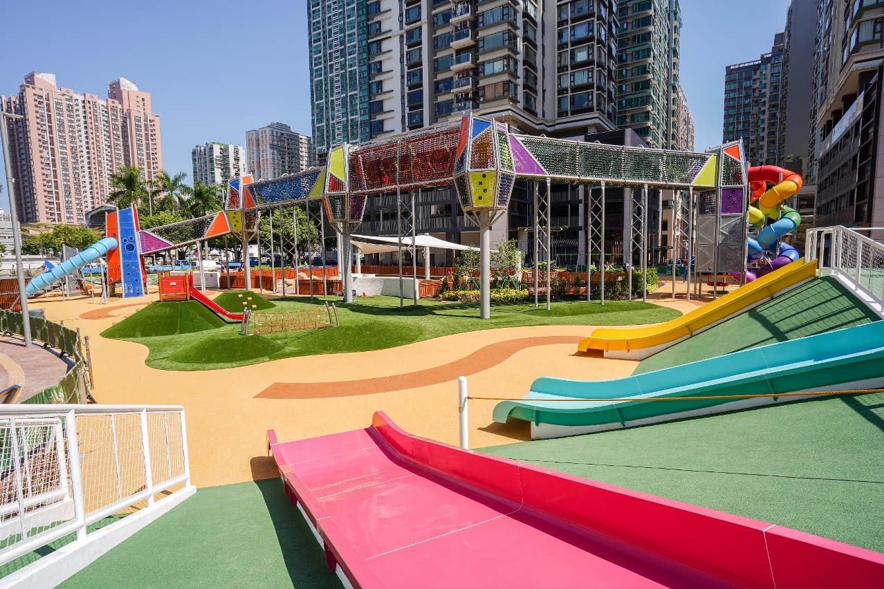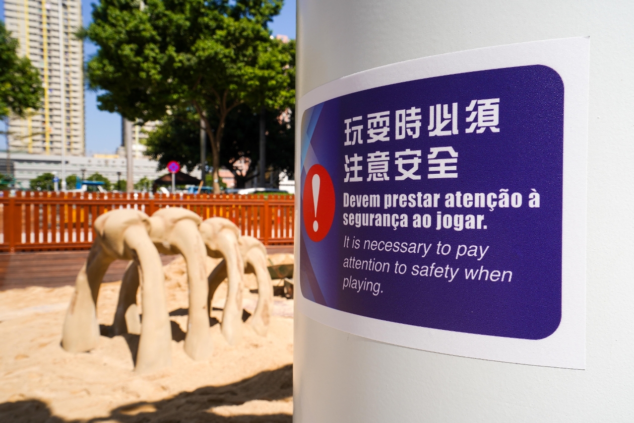 Innovative play facilities are introduced to the children’s playground, including the first outdoor sandpit in Macao Peninsula that would create an environment for mutual assistance and carefree amusement with peers, so that children can easily enjoy the fun of sand and water in the community, and show their creativity in building games with sands. To ensure the safety of young children, those under the age of five must be accompanied by their parents to enter the sandpit. Meanwhile, to control crowds at the early stage after the opening, appointment is required for entering the sandpit. Besides the daily check and cleaning before opening, the sandpit will be closed for maintenance once a month to ensure its quality. There are also a slide area, artificial grass hills and other parent-child play equipment in the playground divided into different zones by age and suitable for children aged 3 to 12 to practise physical coordination and balance. Another group of moderately challenging high-rise play facilities with climbing elements allows older children to learn how to play safely and exercise their physical fitness in the game. IAM has arranged for personnel to maintain order in the playground. Parents and children are advised to follow their instructions and pay attention to safety.