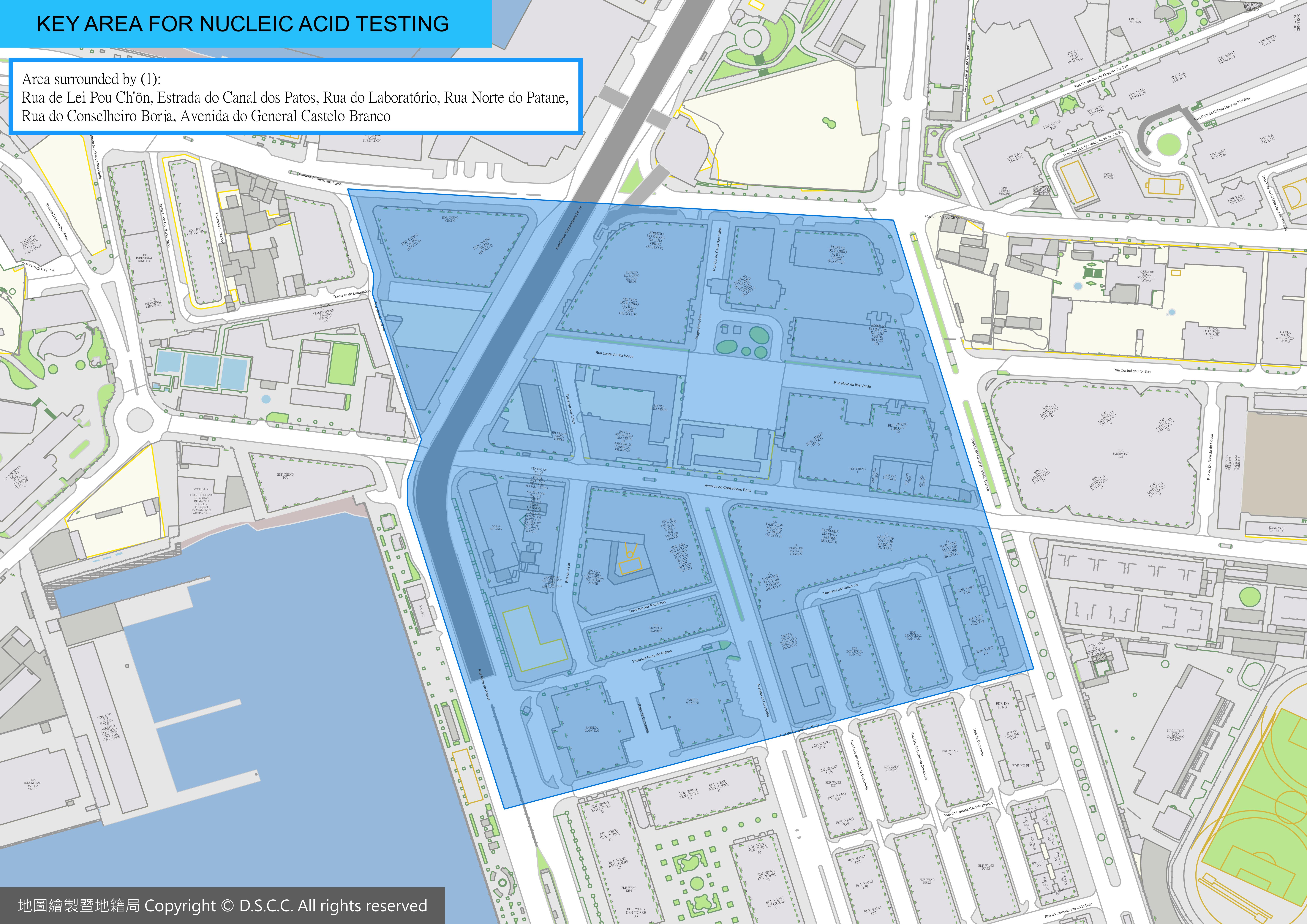 - People who live or work in the area surrounded by Rua de Lei Pou Ch'ôn, Estrada do Canal dos Patos, Rua do Laboratório, Rua Norte do Patane, Rua do Conselheiro Borja, Avenida do General Castelo Branco;